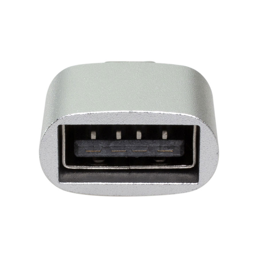Adaptador USB-Micro USB (OTG-B), con cuerpo metálico plateado.
