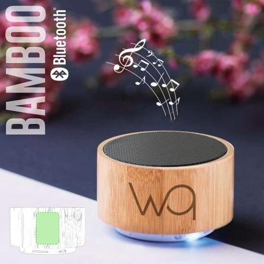 Compacto parlante con cuerpo en bambú/bamboo y conexión Bluetooth®. Con 3W de potencia, función manos libres, radio FM, una ranura para tarjetas mini SD y base antideslizante. Recargable mediante cable USB -incluido- y presentado en caja de color kraft.