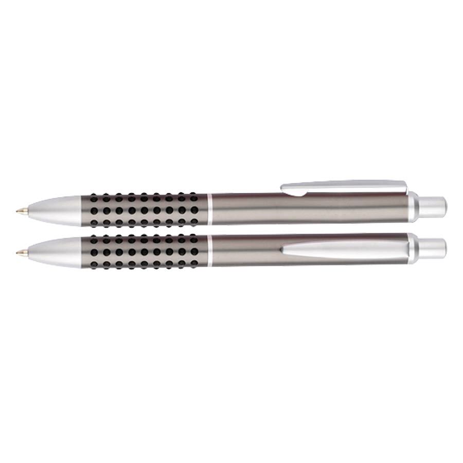 Bolígrafo metálico satinado modelo «Caterpillar», con lunares de goma negra que brindan una suave sensación de masaje dactilar al escribir. Escritura azul.