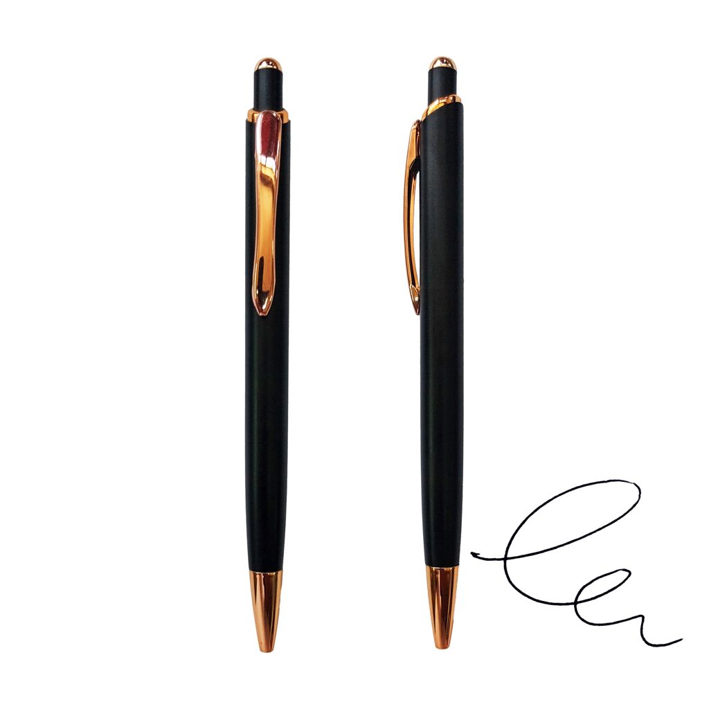 Bolígrafo metálico negro con detalles en cobre electroplateado.