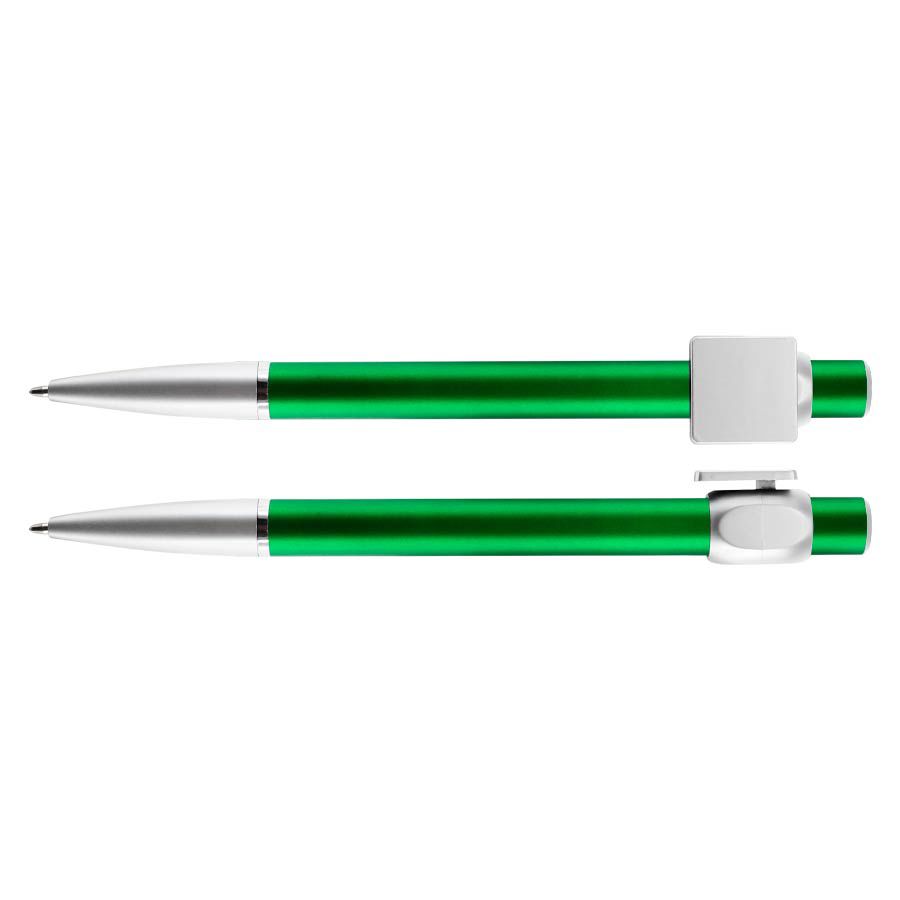 Bolígrafo «Badge» con cuerpo de color metalizado y clip cuadrado plateado, ideal para imprimir isotipos. Escritura azul.