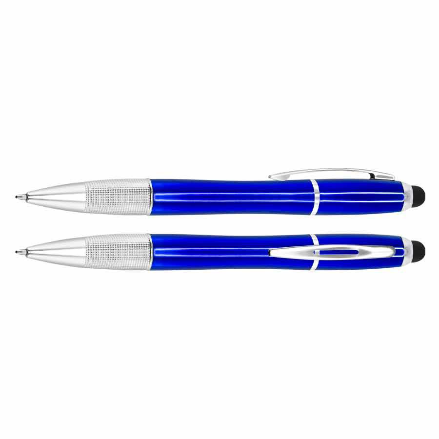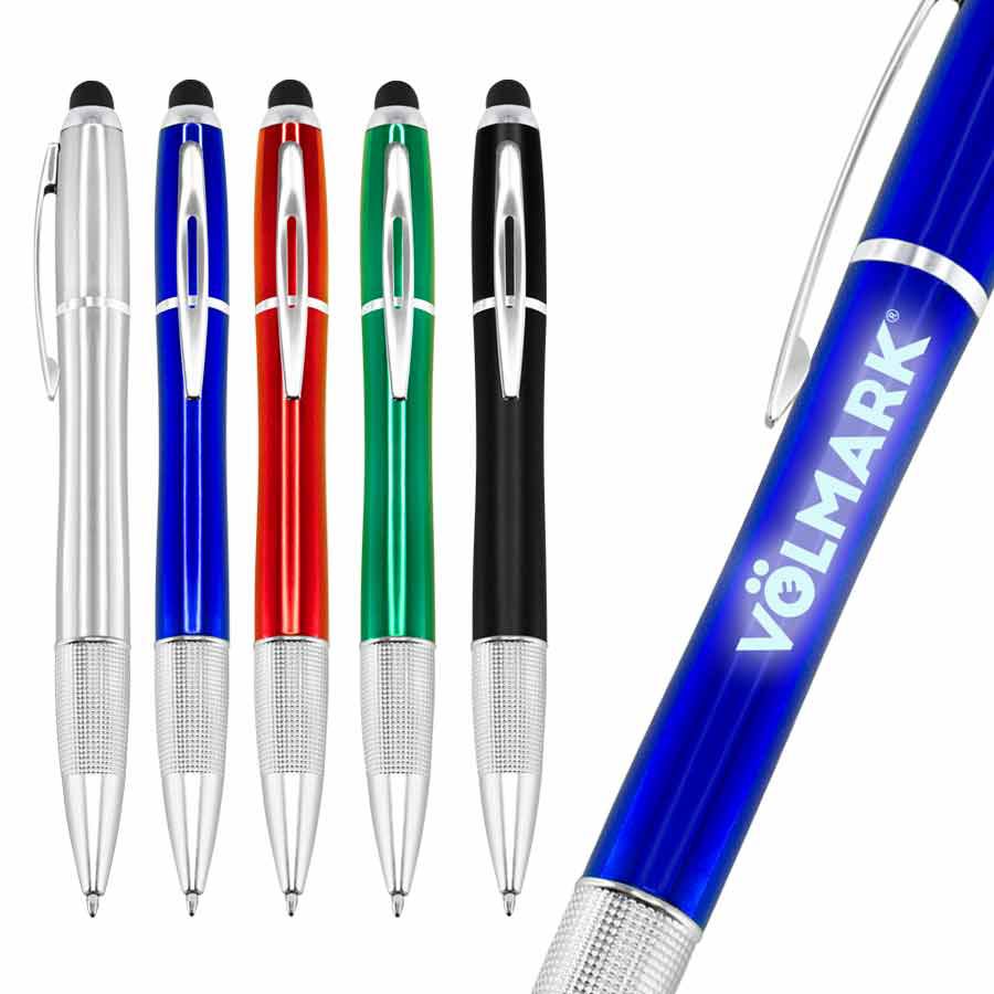 Bolígrafo plástico con puntero screen-touch al tono, modelo «NEON». Incluye luz LED al interior, para retroiluminar logo grabado sobre el cuerpo del bolígrafo. Escritura azul.