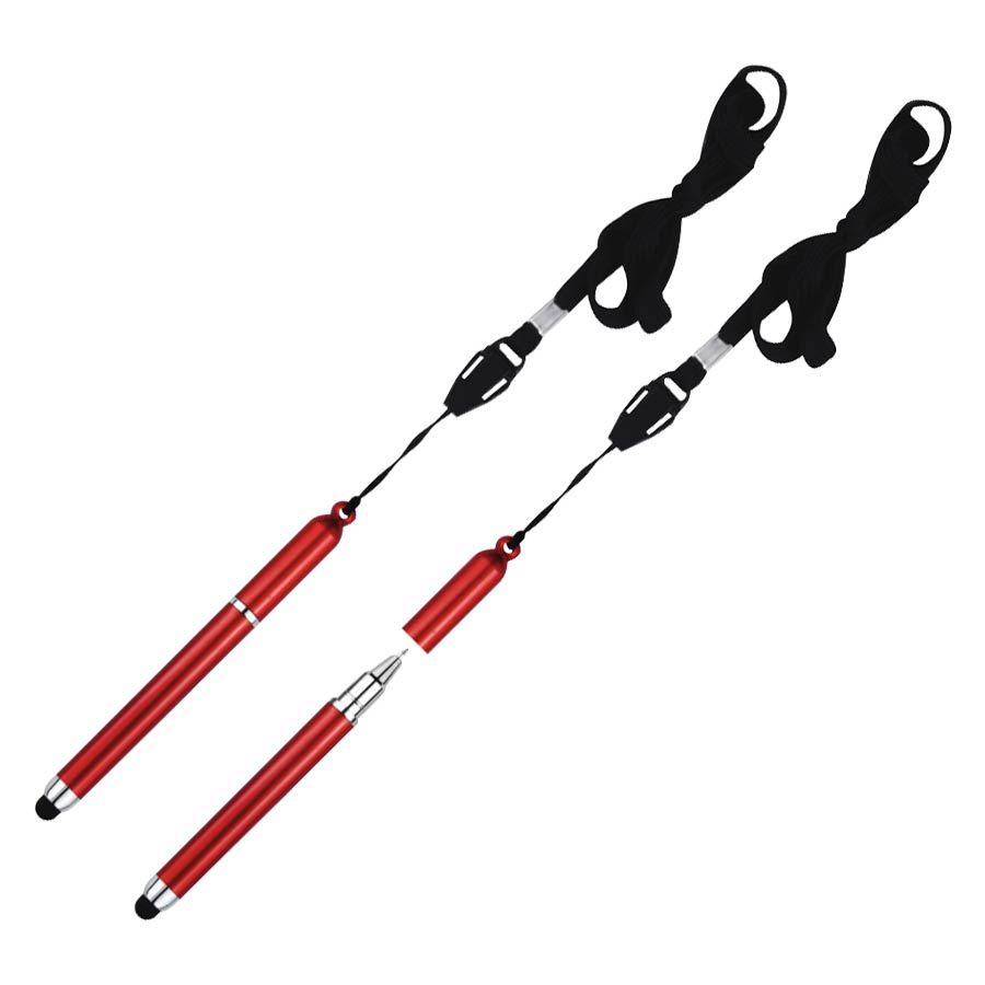 Bolígrafo «Touch-Screen» con goma posterior negra para pantalla táctil. Incluye lanyard colgante negro. Escritura azul.