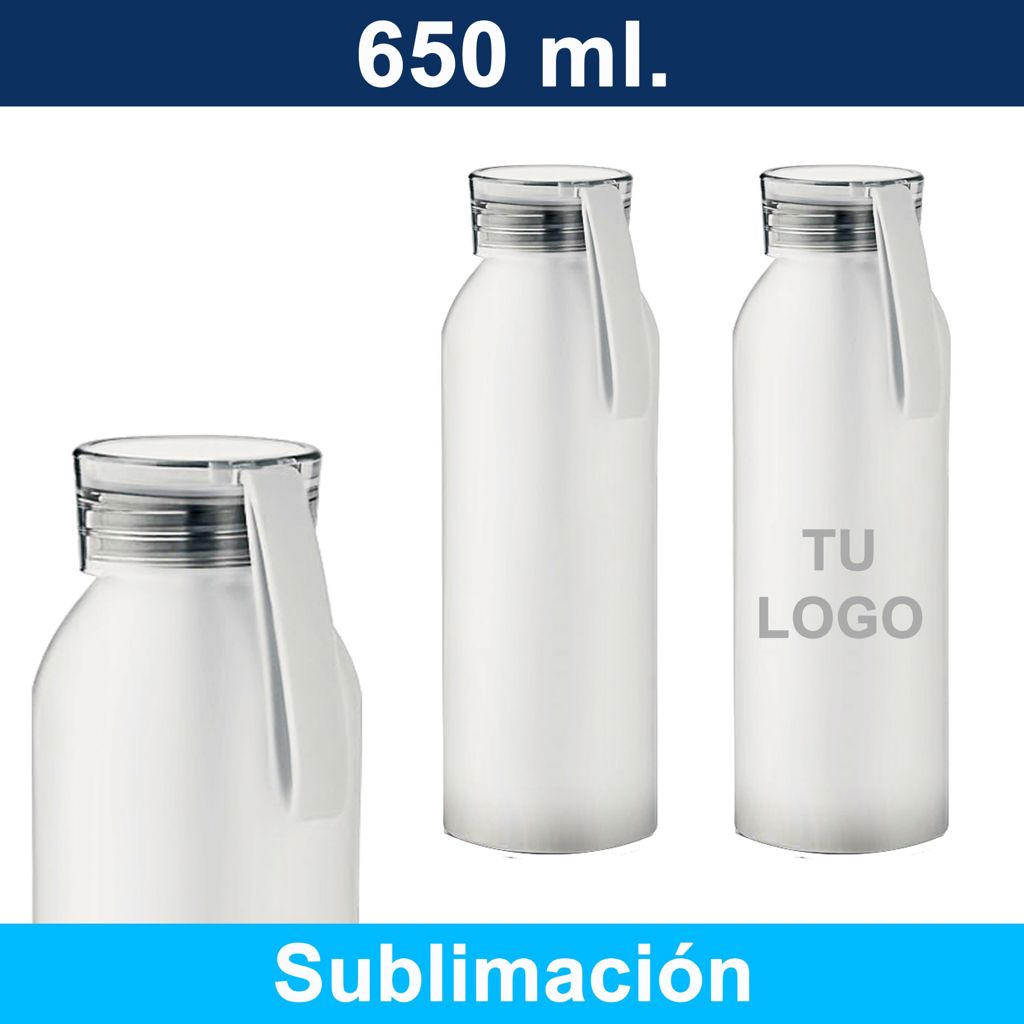 Botella blanca para sublimación de aluminio con tapa de acrílico y asa de silicona para transportar.