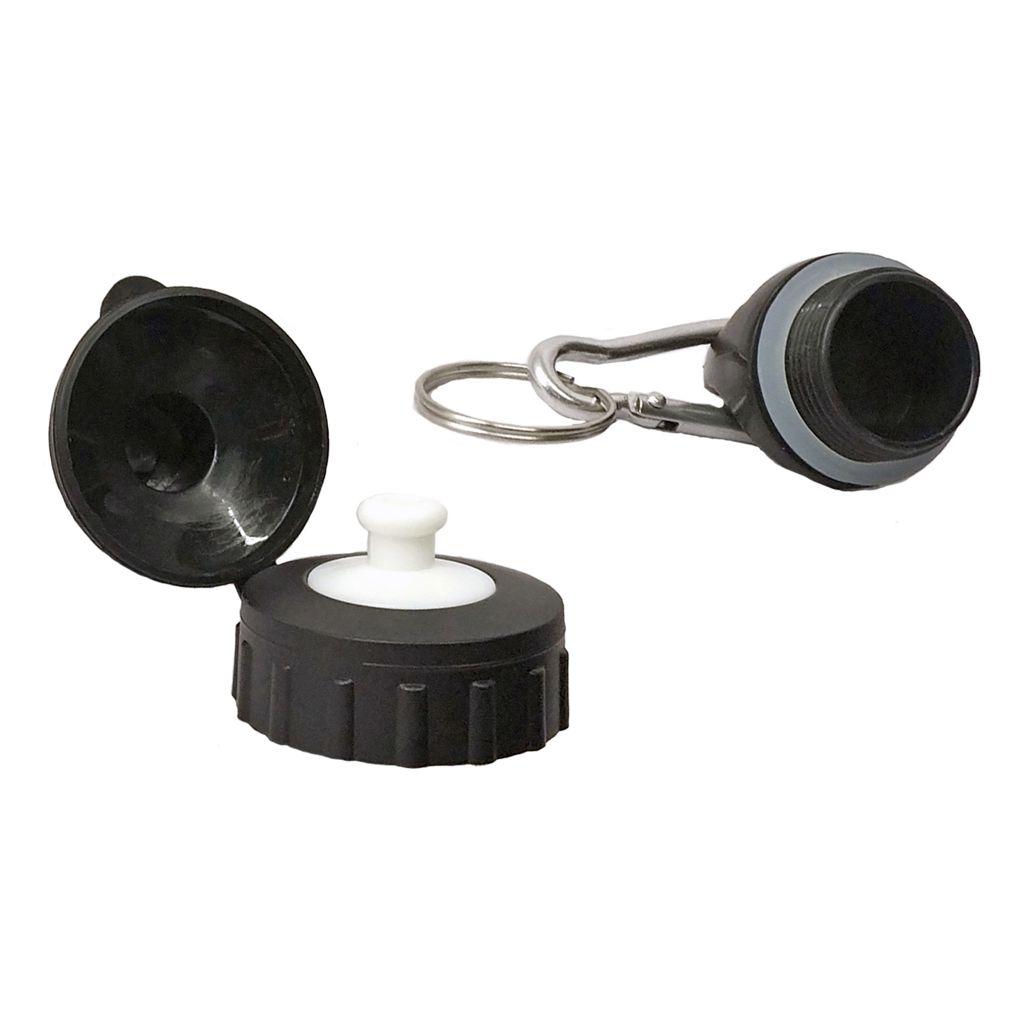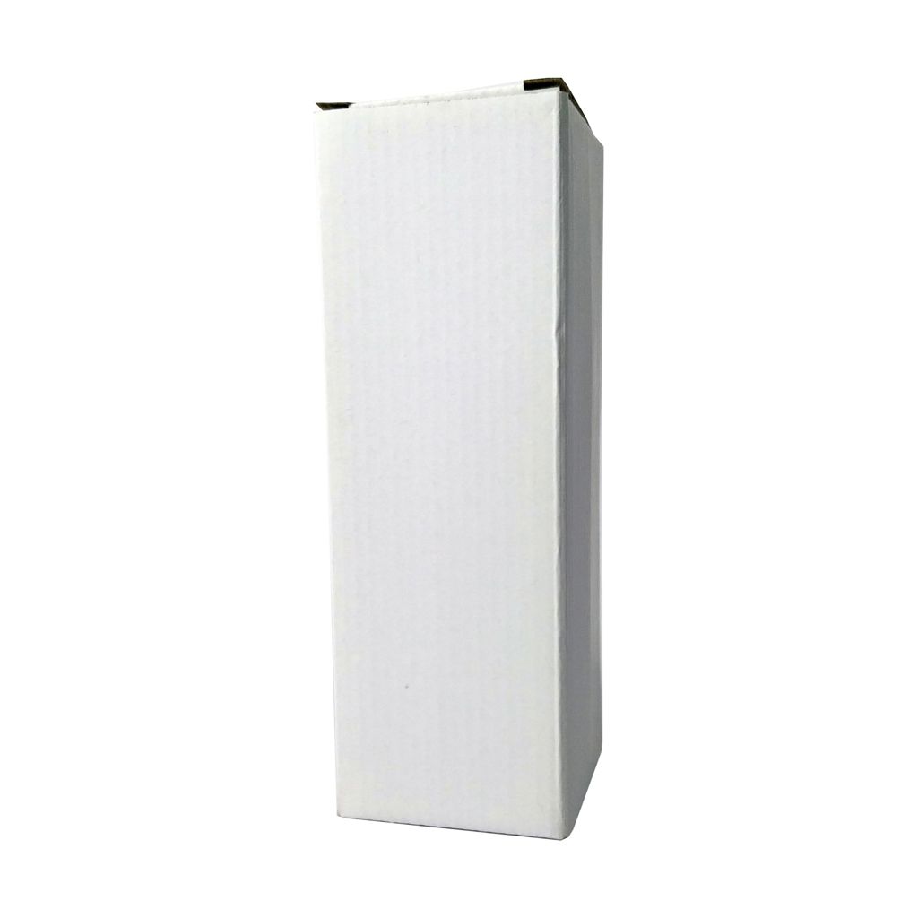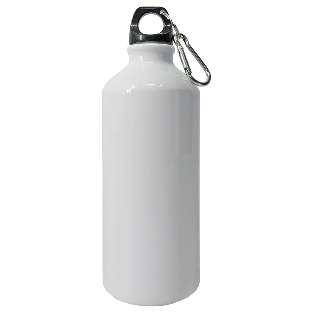 Botella blanca para sublimación de aluminio con tapa dosificador + tapa rosca negra y gancho mosquetón. Presentación en bolsa plástica dentro de caja de cartón blanca.