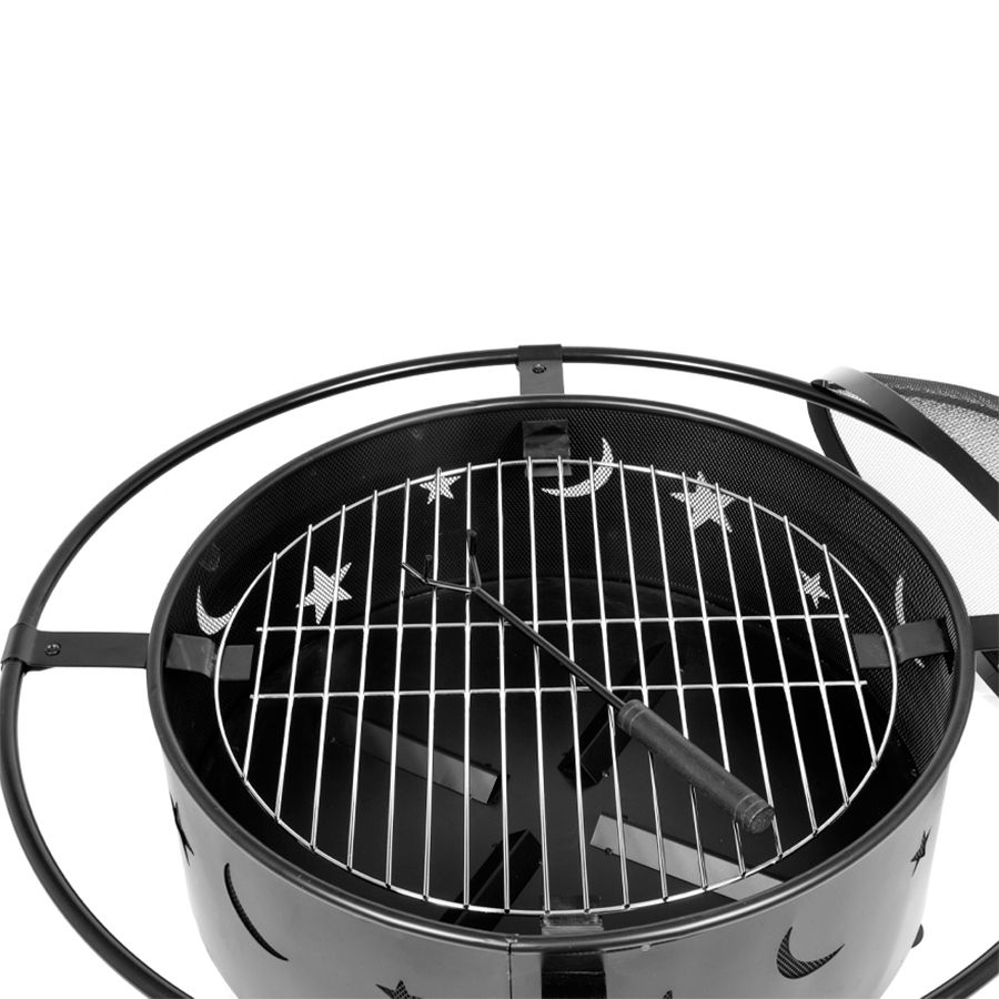 Brasero / Parrilla para Carbón o Leña, de Acero negro, modelo «Centauro». Altura para cocinar: 44cm. Rejilla cromada para cocinar: D50 x 4mm. Tubo exterior: D82cm x 14mm. Tapa con rejilla: D56.5 x 14.5cm. Bowl para fuego: D61 x 22cm x 0.8mm. 3 patas de 25cm x 30mm. Mango removedor de carbón de Regalo. Incluye Manual instructivo de armado en español.