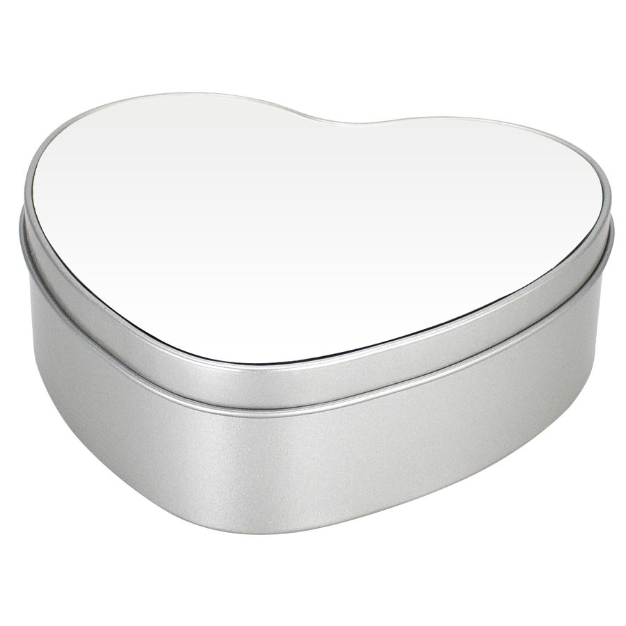 Caja Metálica con forma de Corazón, con tapa y cubierta blanca para Sublimación. Presentación en bolsa de Polipropileno + caja de cartón forrado color natural. Ideal para usar como joyero, especiero o guarda-accesorios. Un regalo práctico y delicado para cualquier mujer.