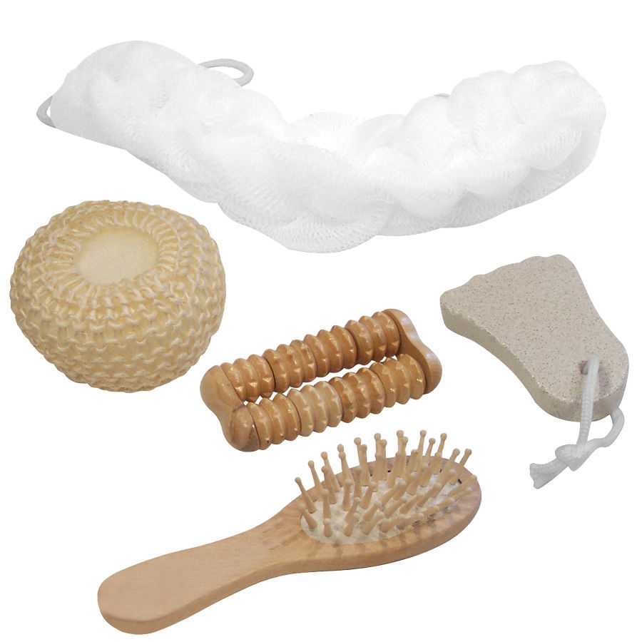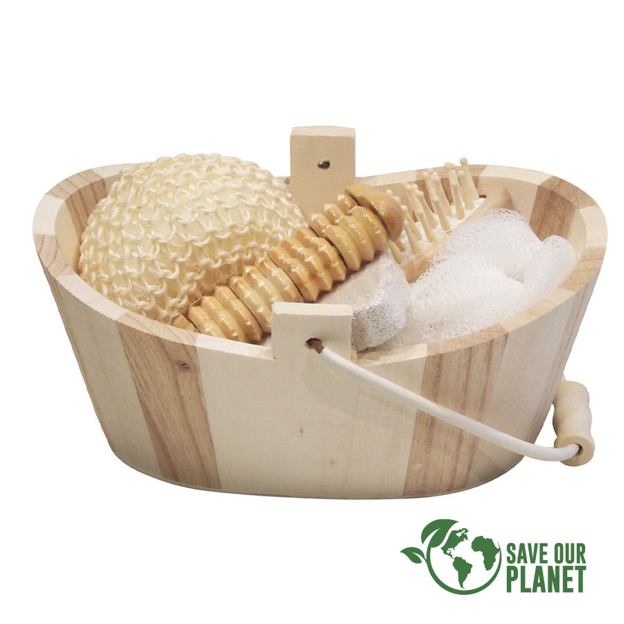 Canasto SPA de belleza en madera modelo «Naturals». Contiene cepillo de pelo, esponja malla, masajeador de madera, piedra pomez y esponja de masaje corporal.