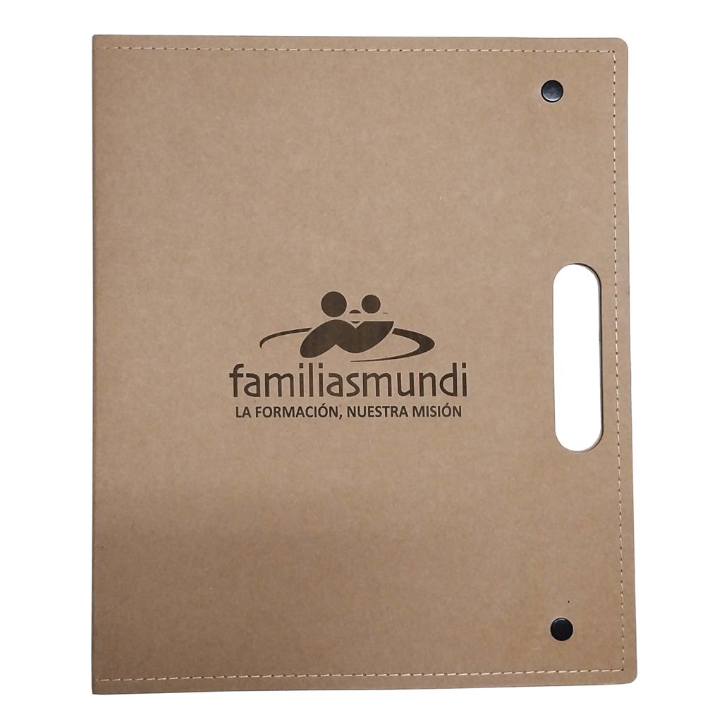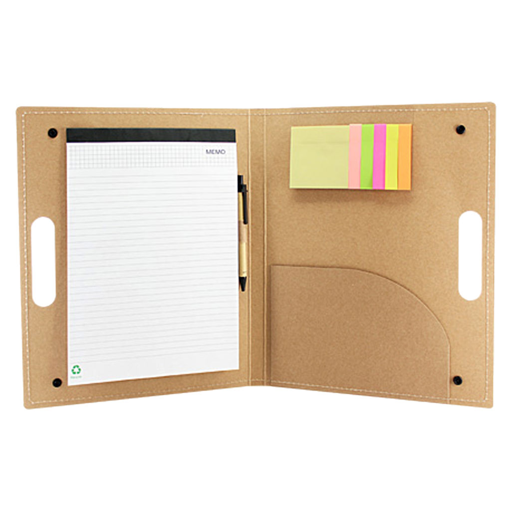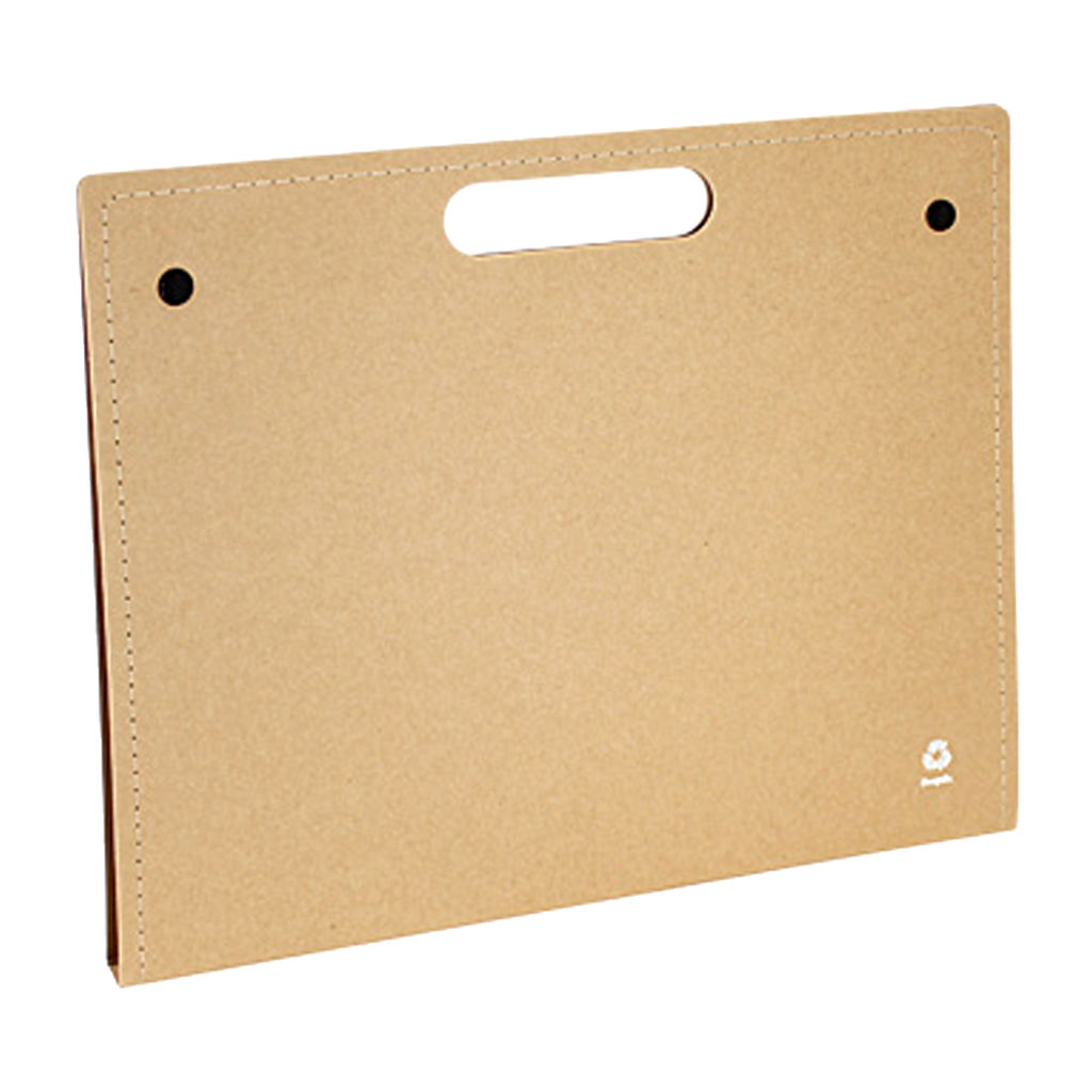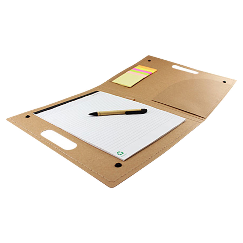Carpeta tipo maletín ecológico de cartón reciclado con cierres y bolsillo interior.