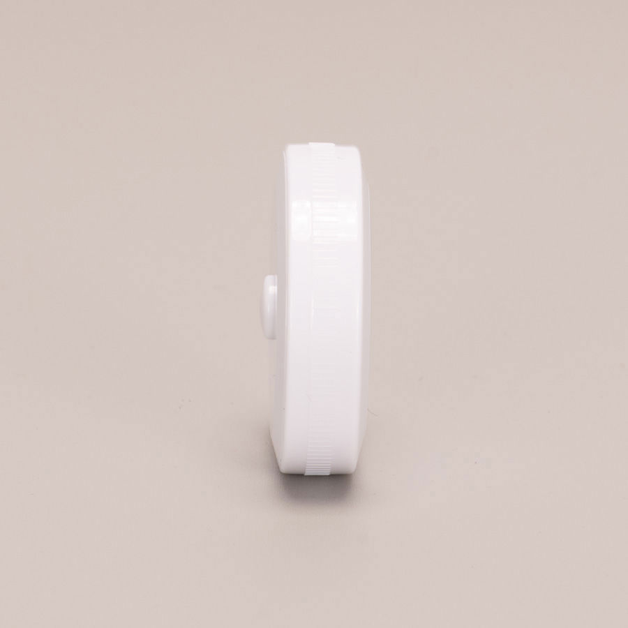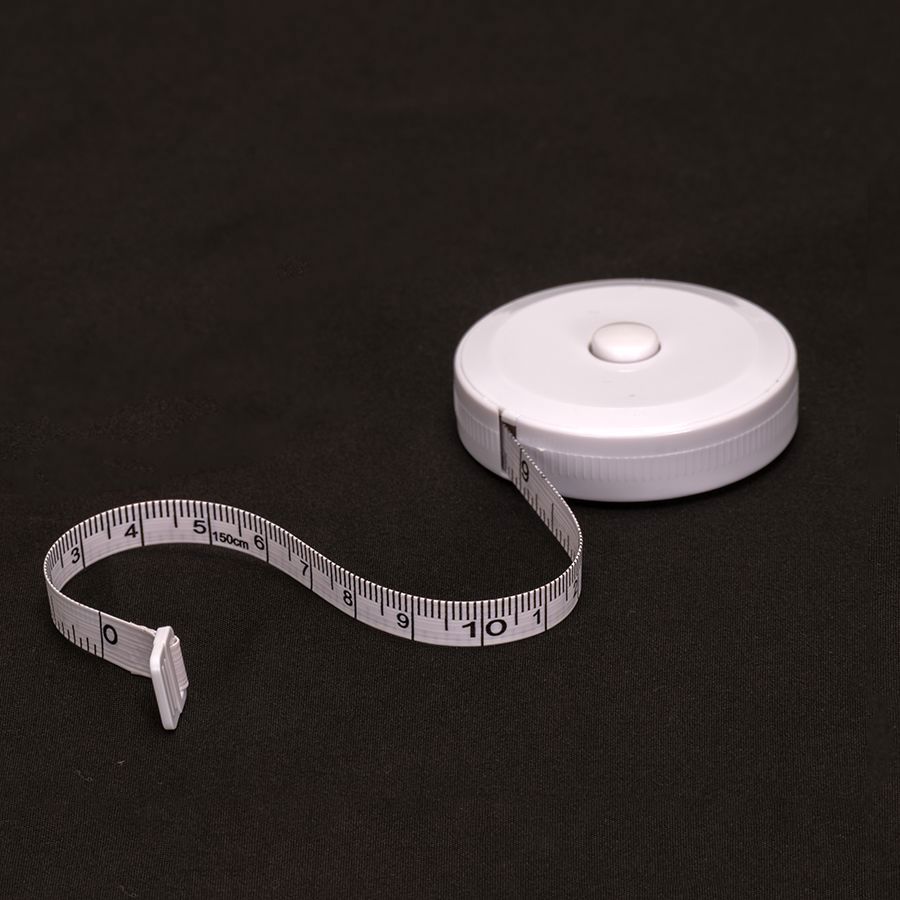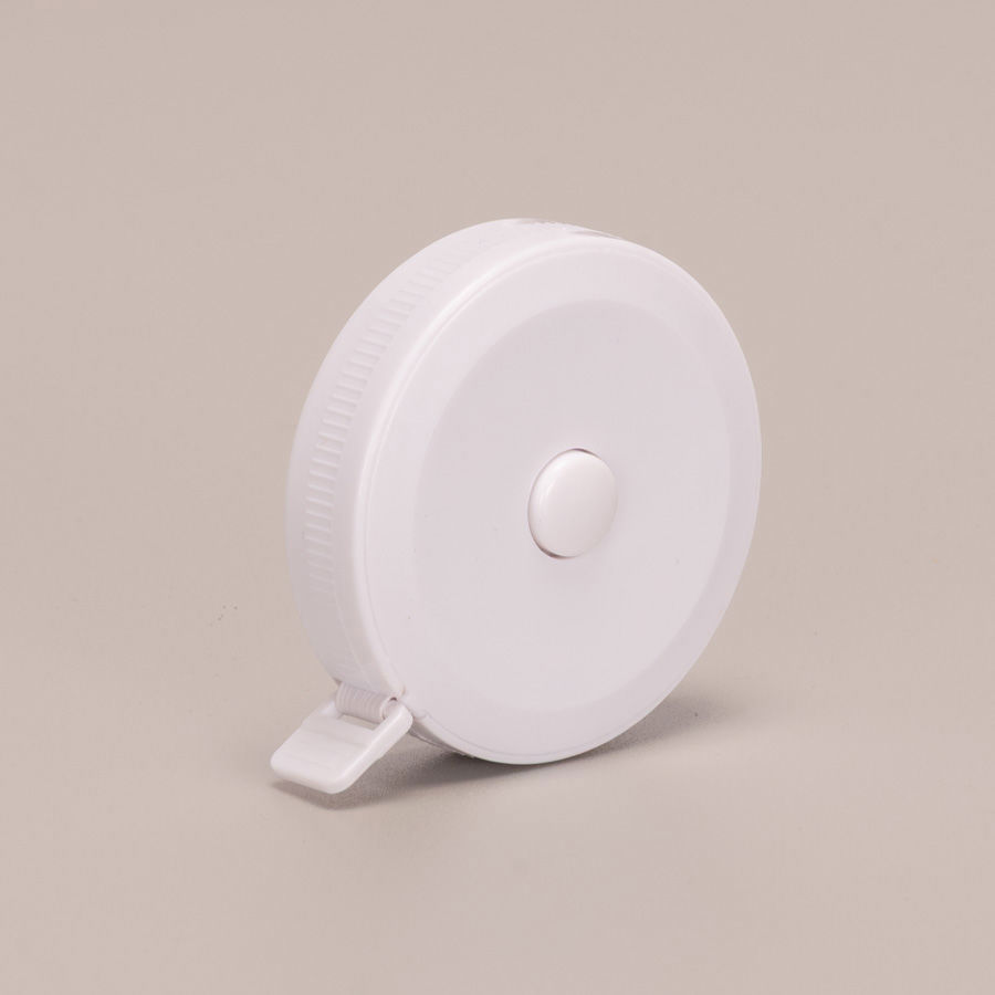 Cinta huincha de medir costurera retráctil flexible 1.5m, cuerpo de plástico ABS, huincha de 1.5m de largo (60 pulgadas por el reverso) de PVC flexible. Presentación en bolsita de PP transparente + caja de cartyón blanco.