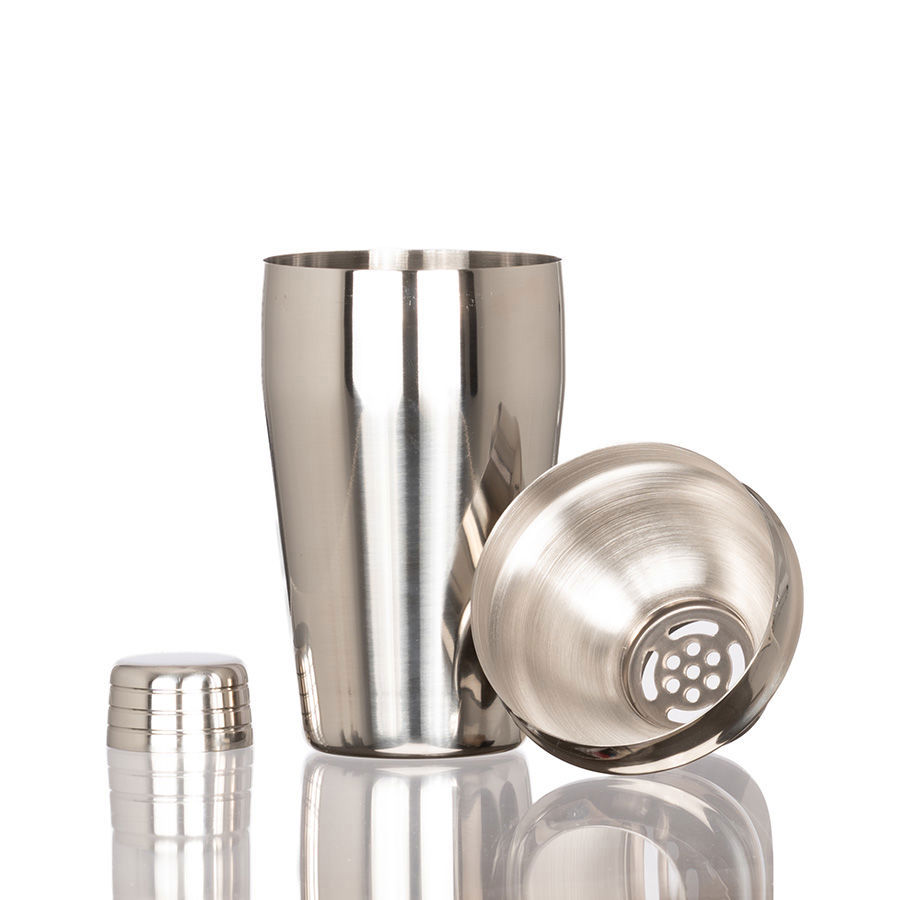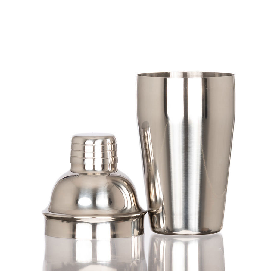 Coctelera de Acero inoxidable 304 SS de 0.8mm de espesor, con superficie lisa plateada. Producto BPA FREE, para el contacto con líquidos y alimentos. Capacidad 500ml. Presentación en plástico burbuja + caja de regalo de cartón negro.