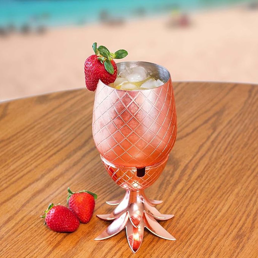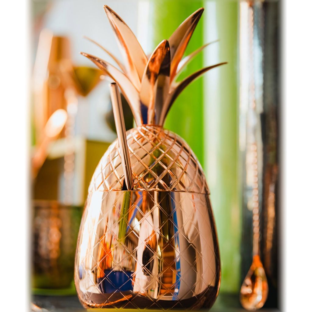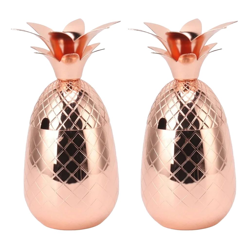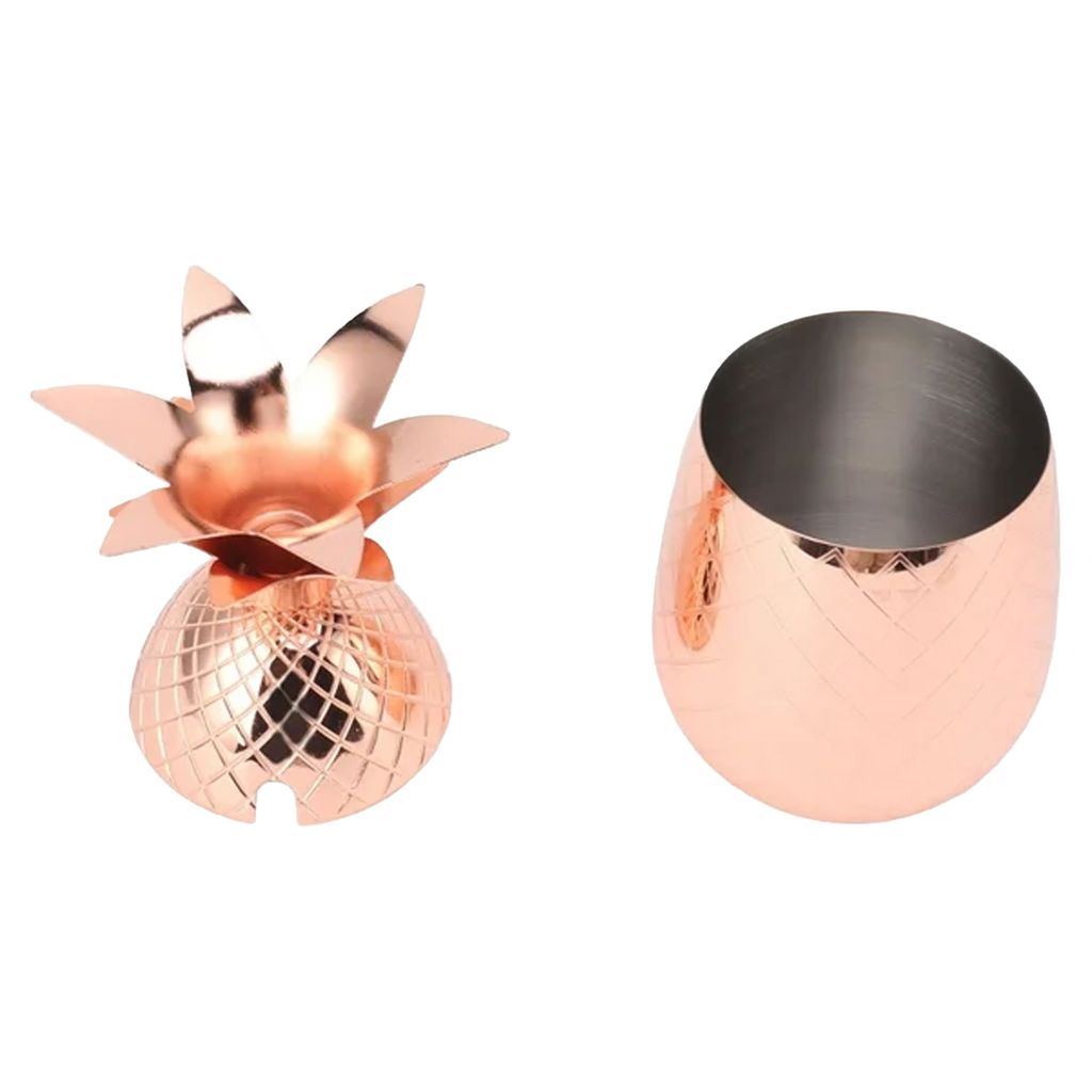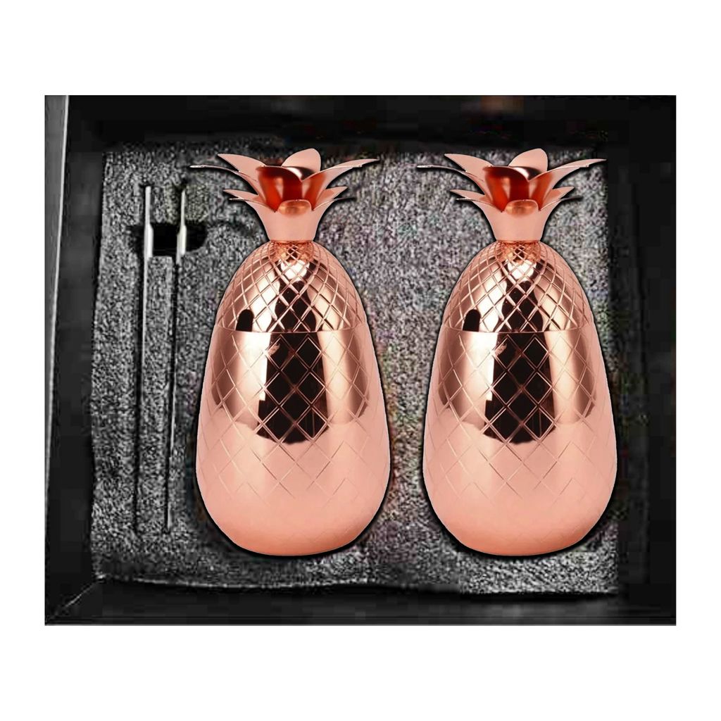 Mug de acero inoxidable electro plateado en cobre en forma de piña. Presentación caja de cartón negro de 2 copas con cama de politileno extendido.