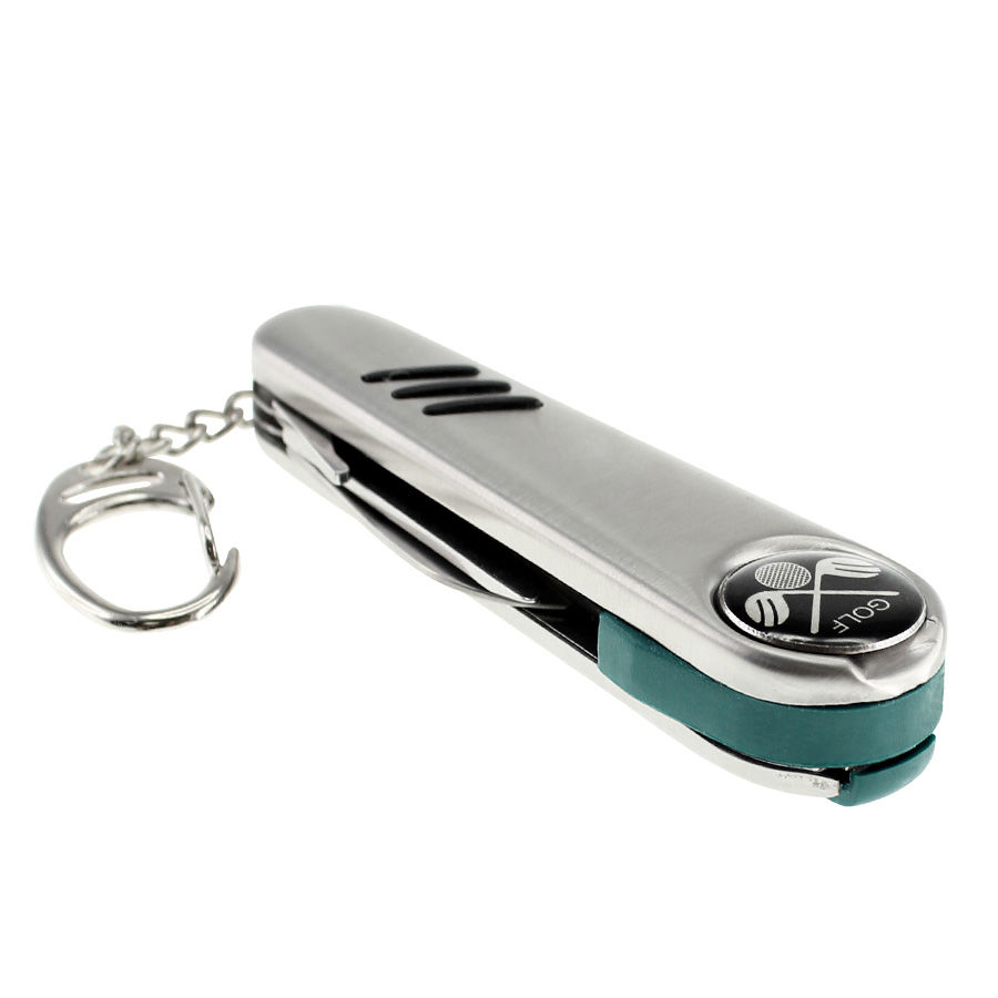 Cortaplumas de Golf de Acero Inoxidable con 7 funciones. Incluye Cuchillo, Levanta-Pique corto, Levanta-Pique largo, Cepillo, Bolígrafo tinta negra, Marcador magnético y llavero. Presentación en caja de regalo plateada.