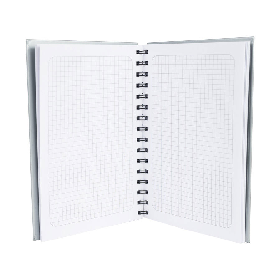 Cuaderno tamaño A5, con tapas de cartón forrado de 650gsm, con 100 hojas blancas con cuadriculado de 5×5 mm. y anillado metálico doble cero.