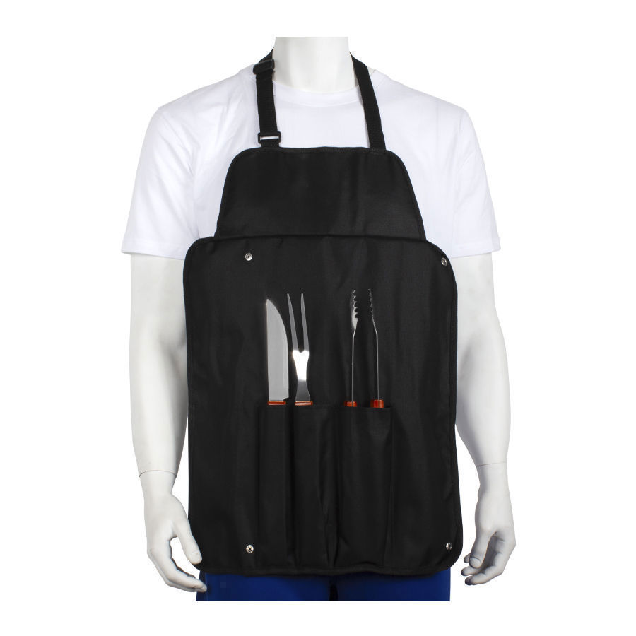 Delantal de tela raquelada negra con 3 prácticas herramientas para asado. Plegable y transformable en bolso. Fácil para bordar o imprimir.