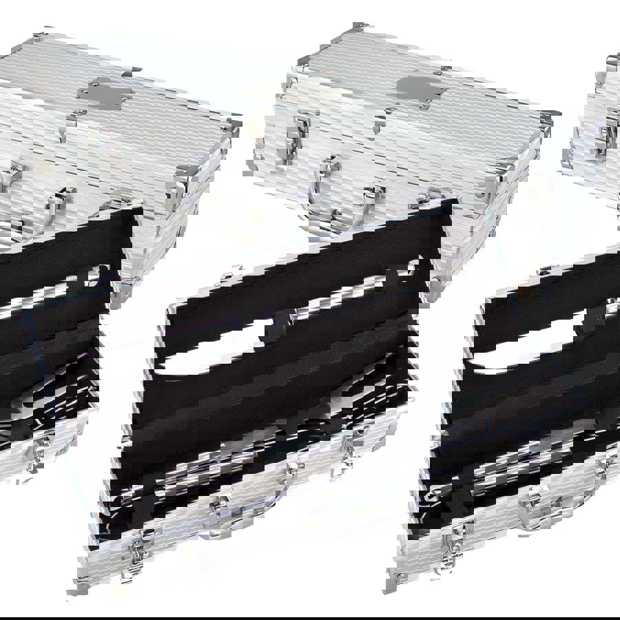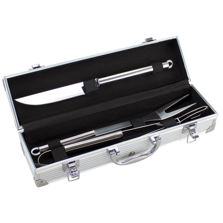 Deluxe BBQ set de asado en caja metálica. Incluye 3 herramientas de asado 100% acero inoxidable: cuchillo, tenedor y tenazas. Interior recubierto en tela ecológica negra. Manilla y cierres metálicos. Incluye placa metálica rectangular para grabar logo. Presentación bubble-bag + elegante caja de cartón laminado plateado.