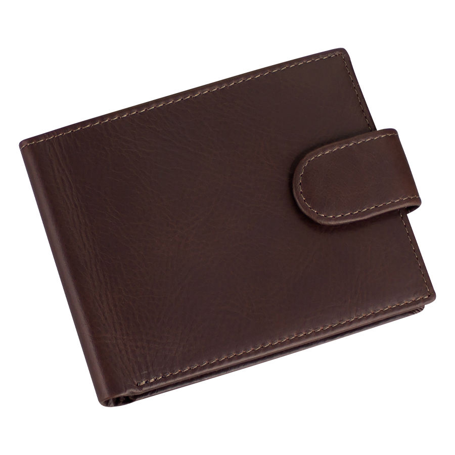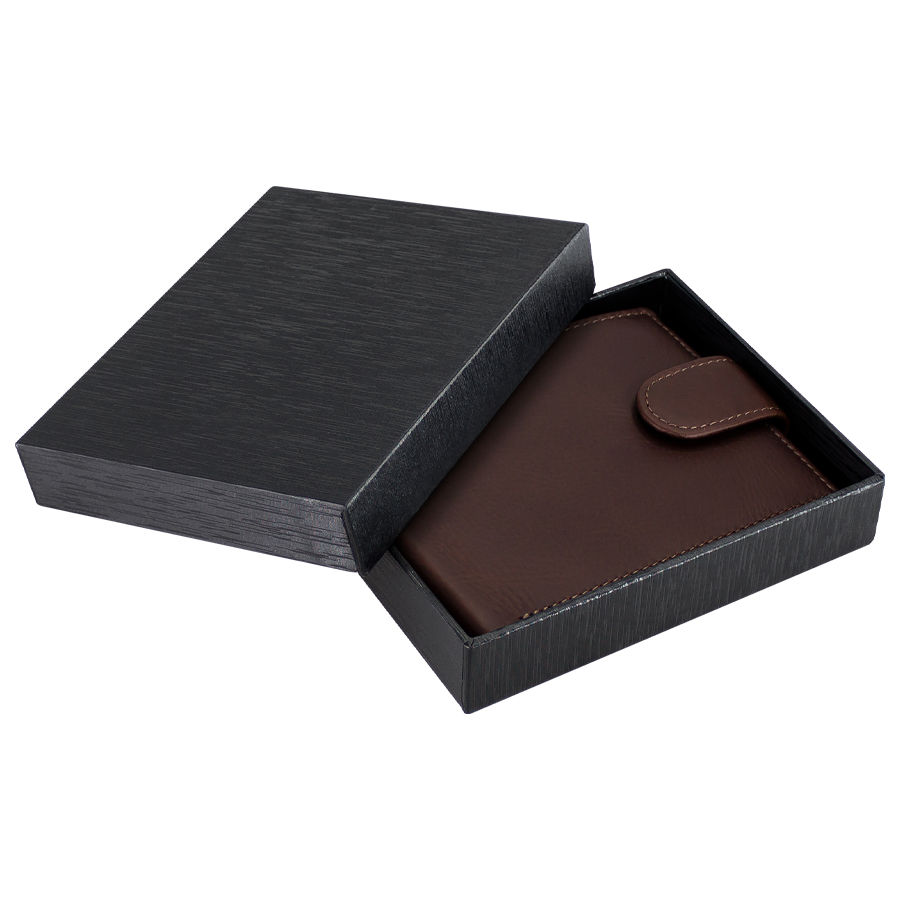 Deluxe Billetera de cuero natural Marrón con broche. Finas terminaciones. 17 compartimentos interiores (3 secciones). Alta resistencia al uso. Presentación en bolsa frozen y caja de cartón forrado negro texturado.