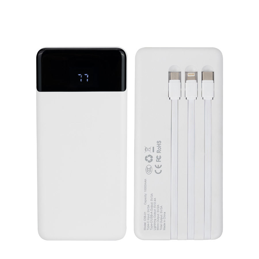 Deluxe cargador Power-Bank USB con pantalla indicador de carga. Capacidad 10000mAh. Amplio espacio para logo. Input: DC 5V 3A / Output: DC 5V 3A. Viene con 3 cables incorporados: micro USB, Tipo C, i-phone. Incluye cable de carga USB / Tipo C. Incluye manual de uso en español e inglés. Presentación en Estuche de cartón forrado color blanco. Producto con Certificaciones.