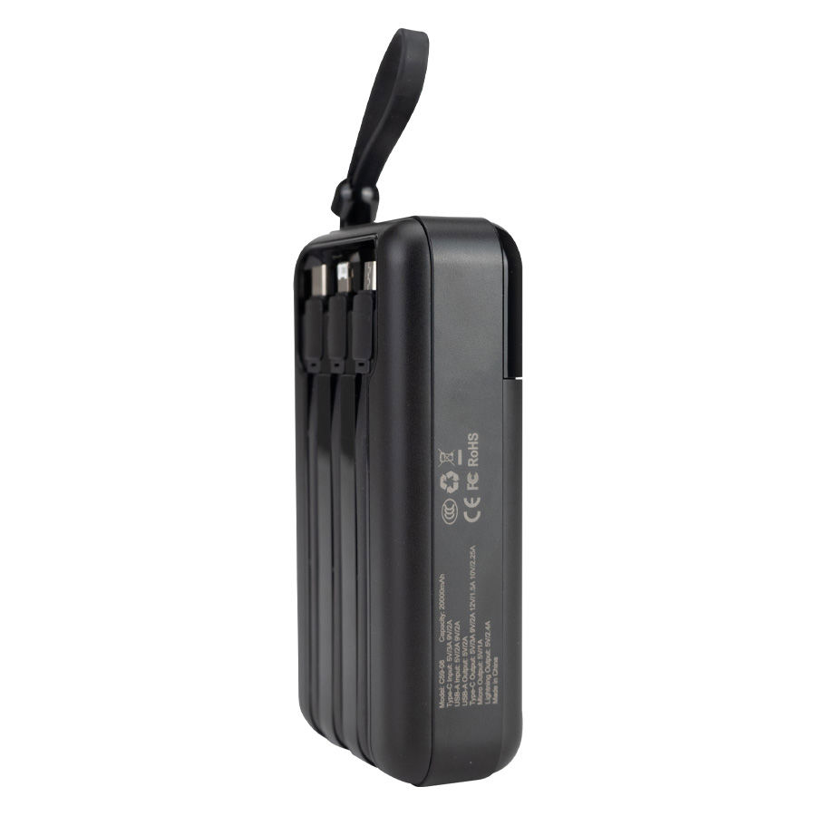 Deluxe cargador Power-Bank USB con pantalla indicador de carga. Capacidad 20000mAh. Amplio espacio para logo. Input: DC 5V 3A / Output: DC 5V 2A. Viene con 3 cables incorporados: micro USB, Tipo C, i-phone. Incluye cable de carga USB / Tipo C. Incluye manual de uso en español e inglés. Presentación en Estuche de cartón forrado color negro. Producto con Certificaciones.