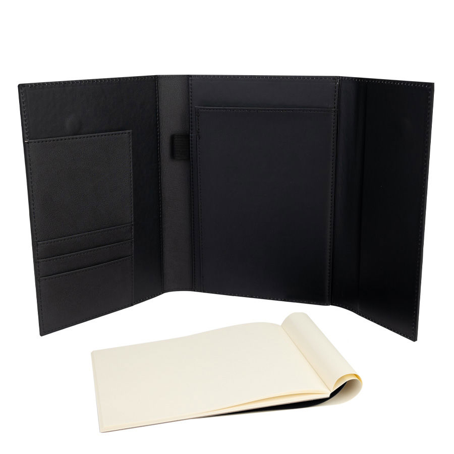 Libreta de Apuntes con 50 hojas lisas amarillas de 13.5 x 20.5 cm., presentada dentro de fina carpeta de PU negro con interior porta-documentos, porta-bolígrafo y cierre imantado, protegida por lámina de tela no tejida color negro. Presentación en elegante caja de cartón piedra esmaltado negro y funda de papel negro. Un gran regalo para nivel ejecutivo.