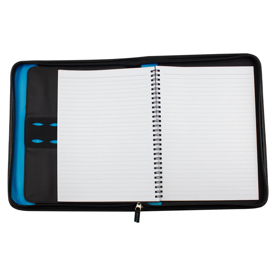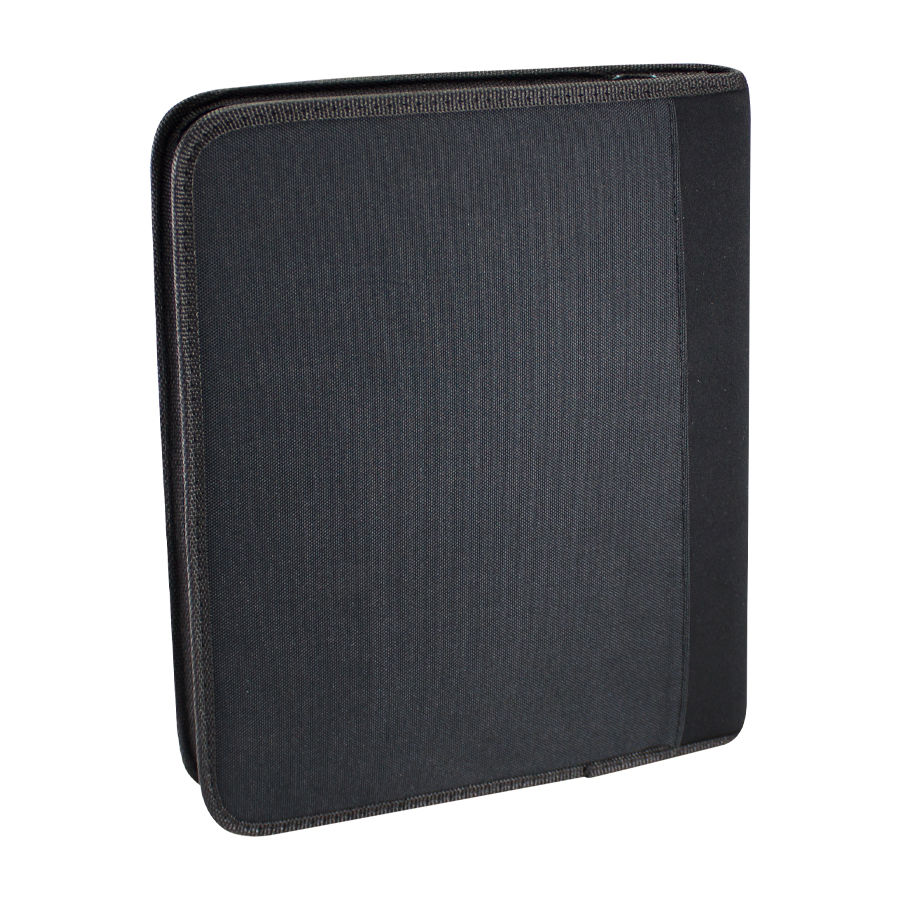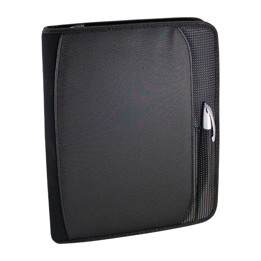 Para el Ejecutivo de hoy. Deluxe Portafolio modelo «President» con Bolso Porta-Tablet removible. Incluye Cuaderno de 50 hojas lineadas, compartimentos para tarjetas, bolígrafo, documentos y celular. Cierre cremallera. Material PU + Polyester 1680D.