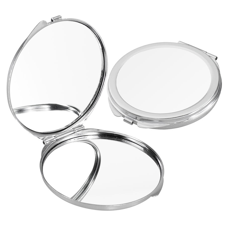 Espejo metálico redondo doble, con tapa, con círculo para Sublimación. Presentación en caja laminada blanca.