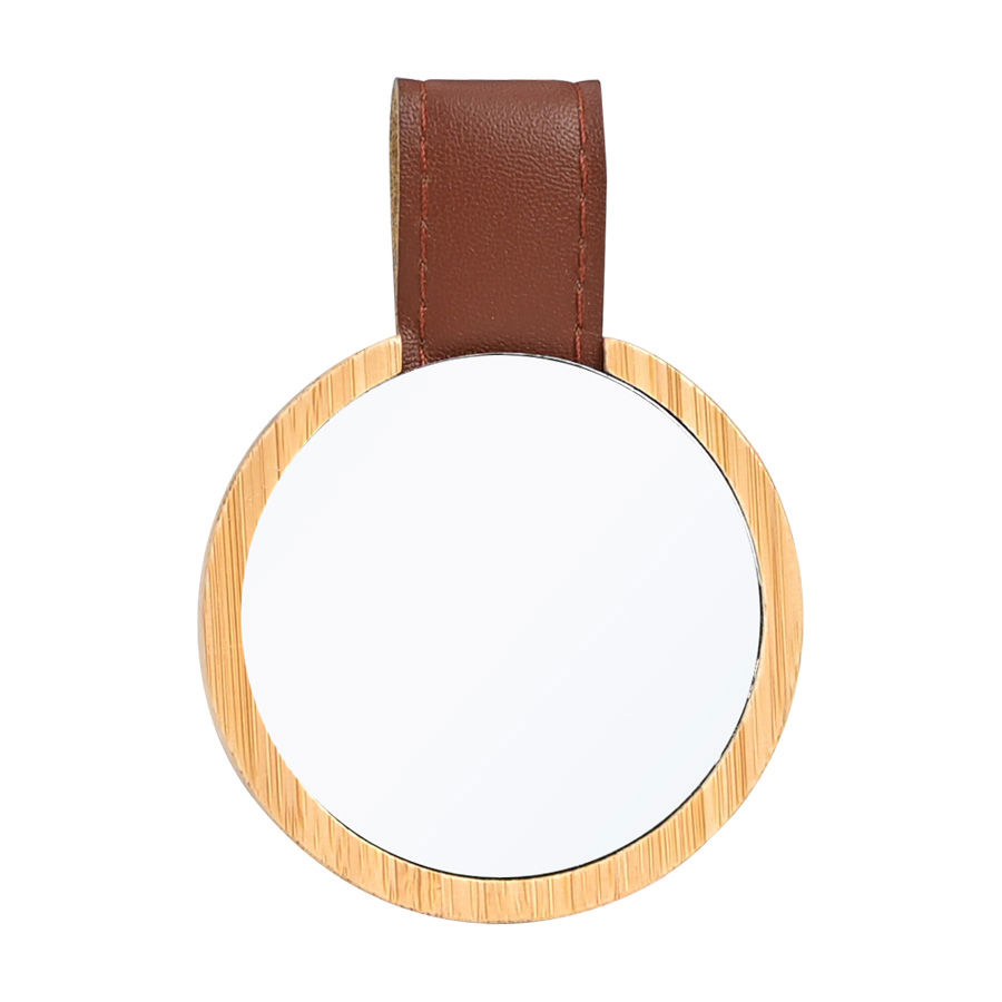 Espejo redondo con cuerpo de madera de Bamboo y correa de Eco-Cuero café.