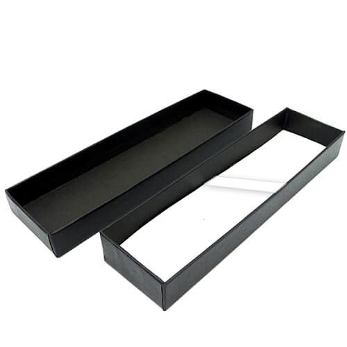 Estuche de presentación de cartón color negro con interior acolchado blanco y cinta satinada para soporte de bolígrafo.