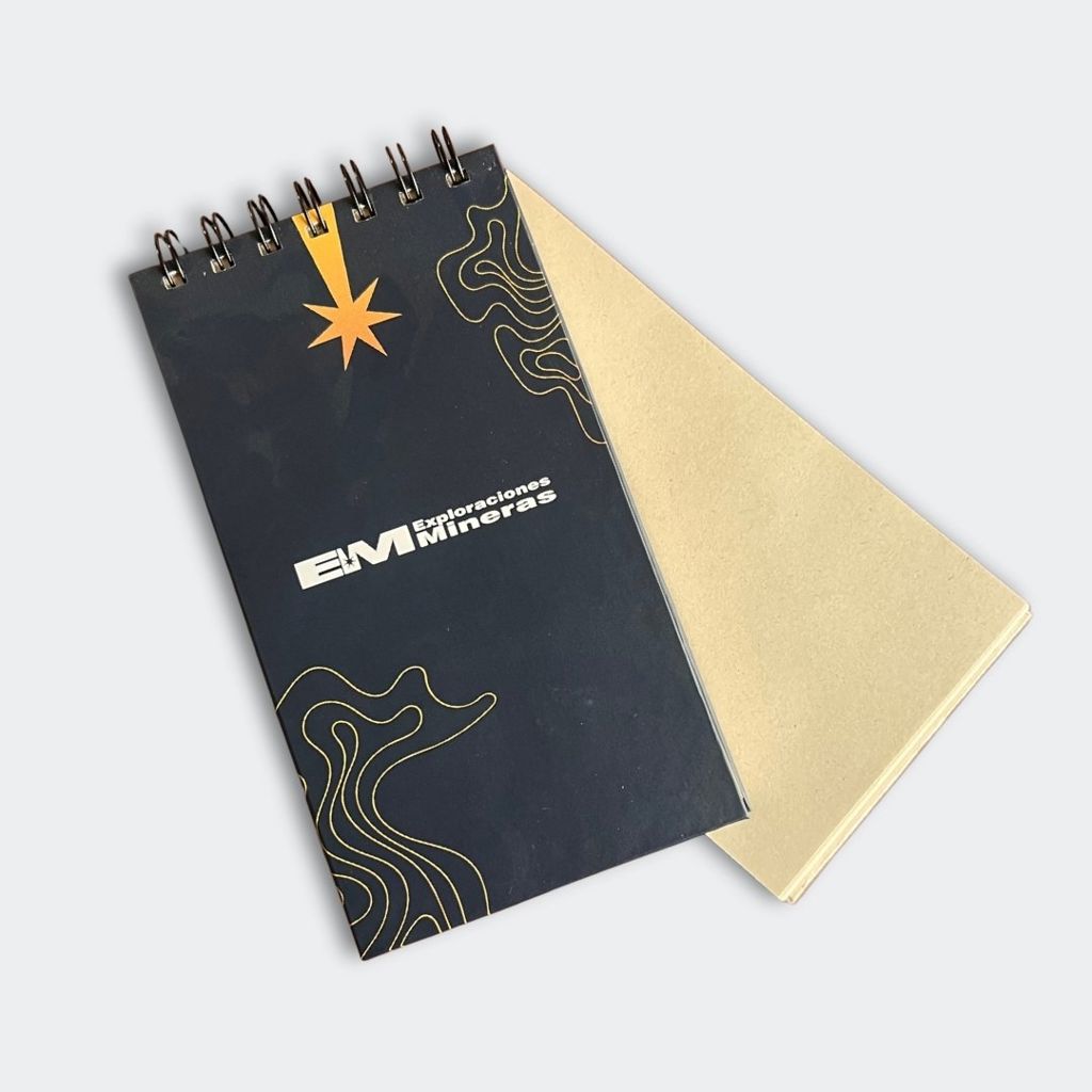 La libreta cuenta con impresión a color en tapa frontal y trasera (4/0), utilizando el diseño entregado por el cliente, permitiendo una personalización completa acorde a la identidad visual de cada marca 🎯.