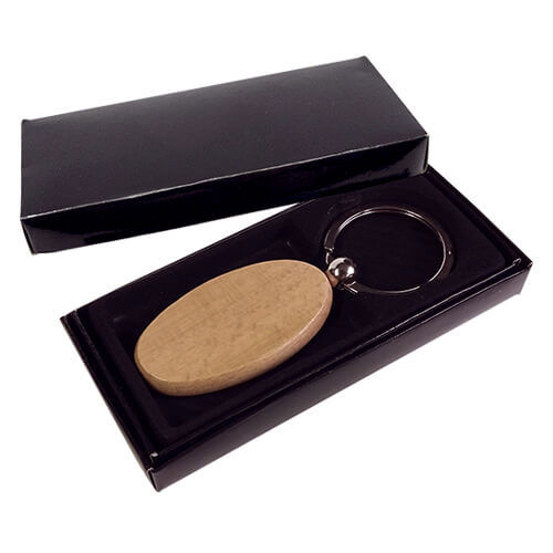 Llavero de bambú con forma ovalada.