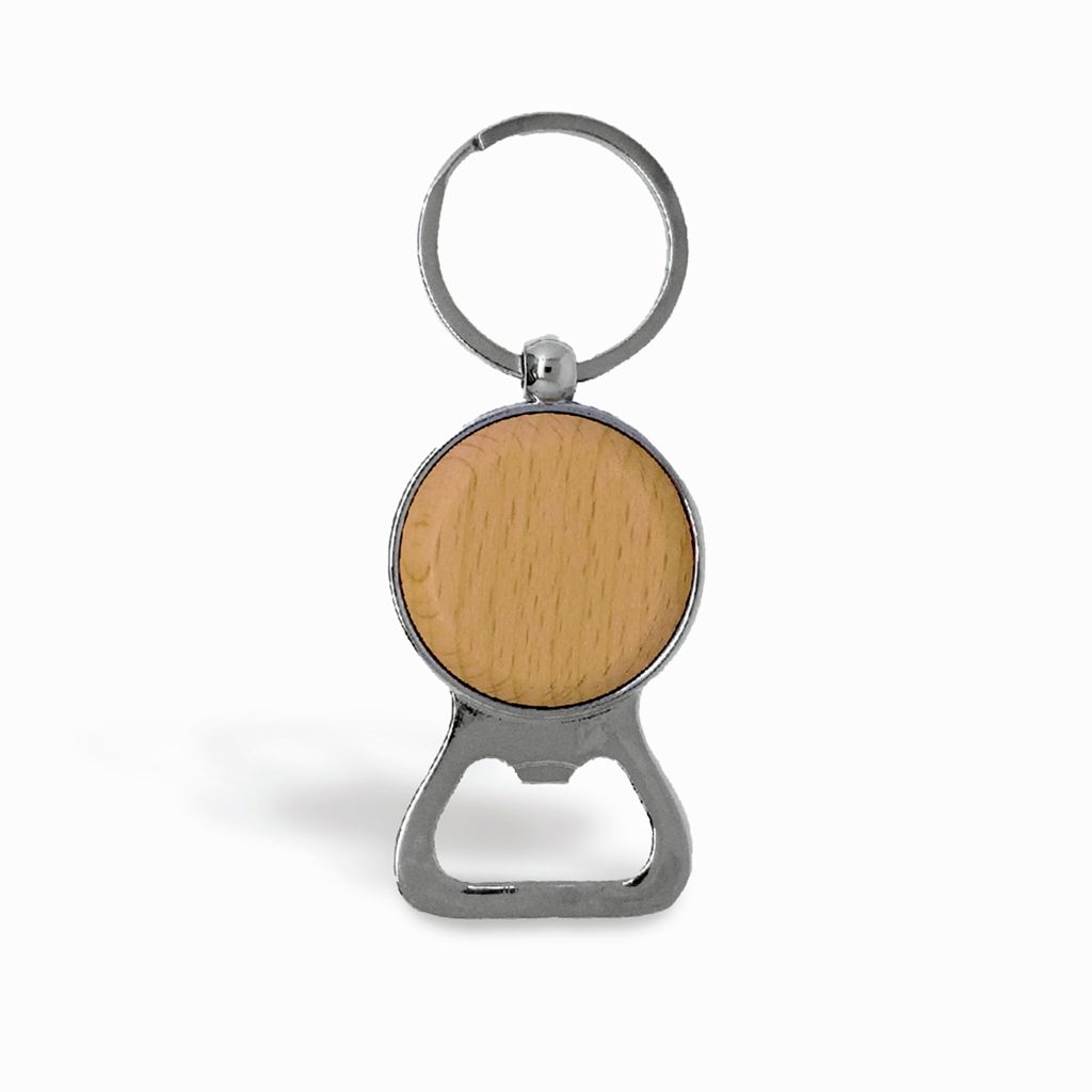 Llavero destapador metálico con aplicación de bambú. Acabado brillante.