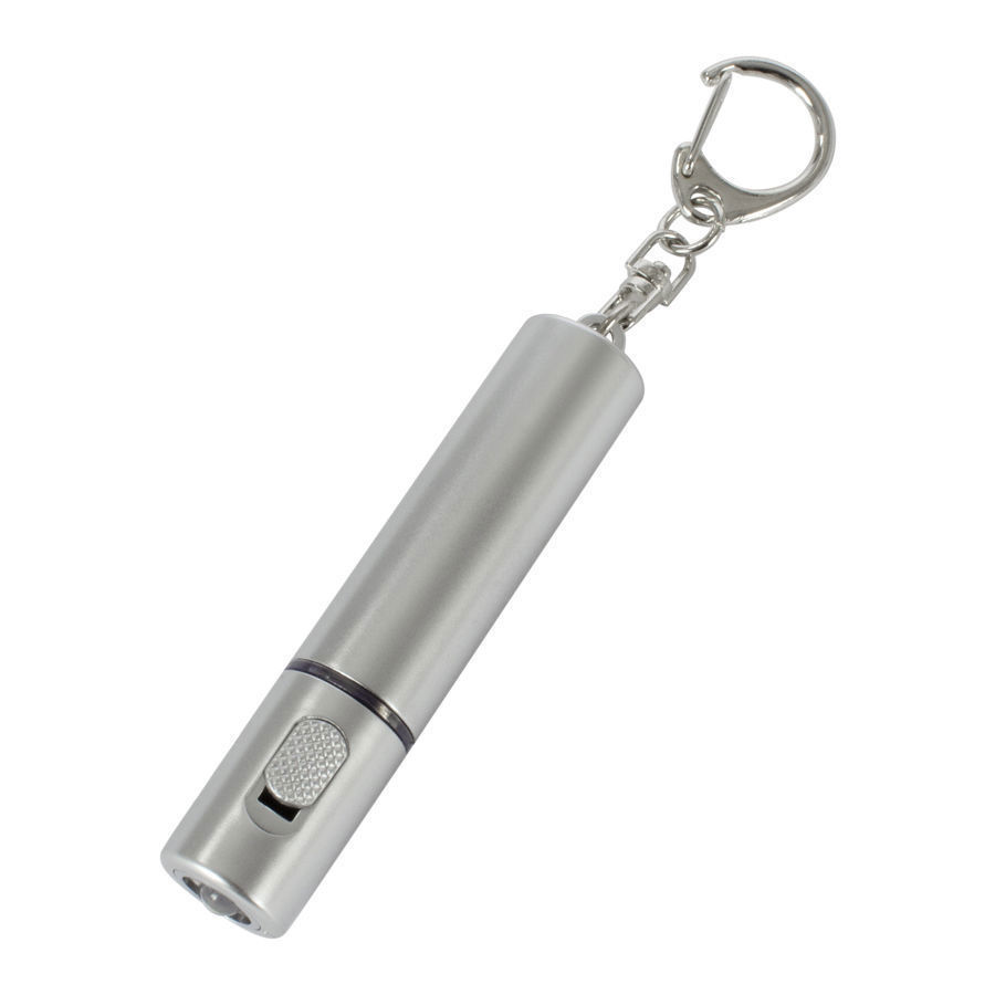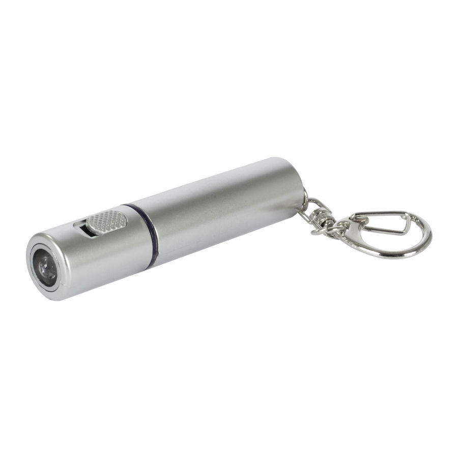Llavero-Linterna LED plástica color plata. Usa 1 pila botón (incluida).