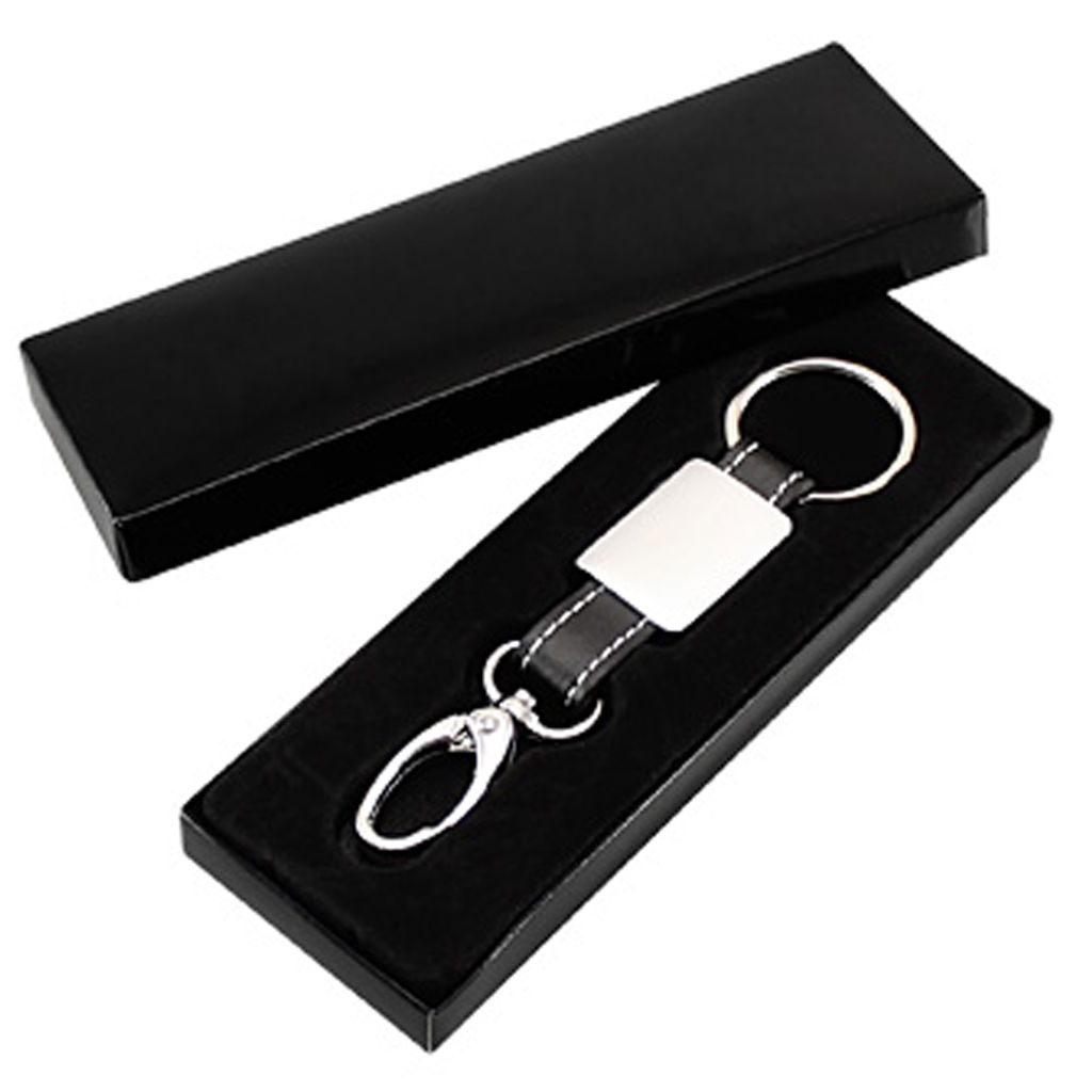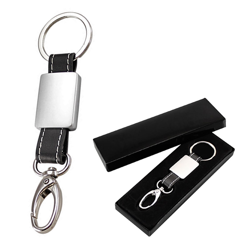 Elegante llavero metal-cuero negro con argolla de seguridad y gancho mosquetón.