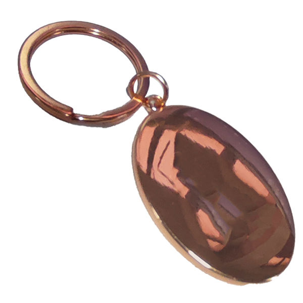 Llavero metálico ovalado encobrizado con placa negra.