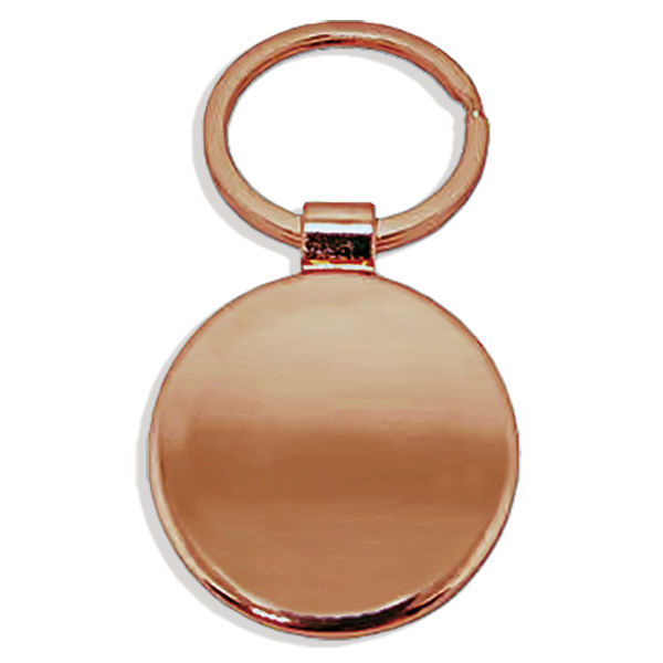 Llavero metálico redondo encobrizado con placa negra.