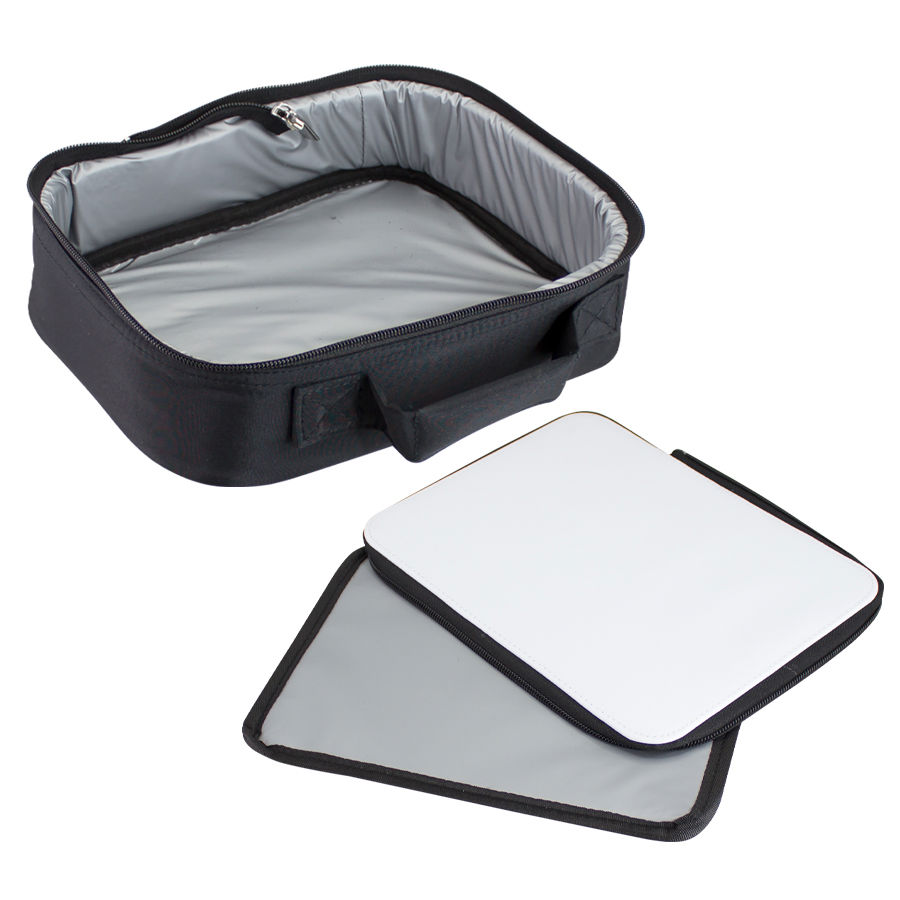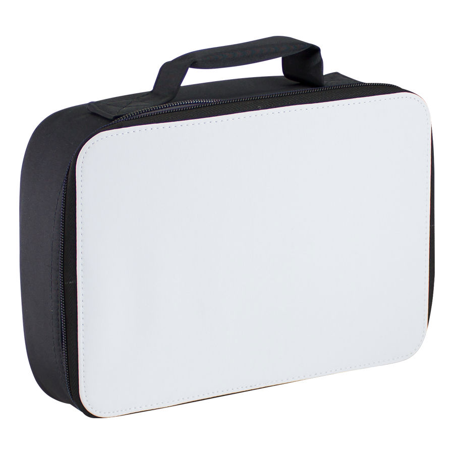 Lonchera de Microfibra, con interior cooler con aislante térmico plateado. Incluye mango y tapa dura en tela blanca para Sublimación a todo color. Cierre eclair.