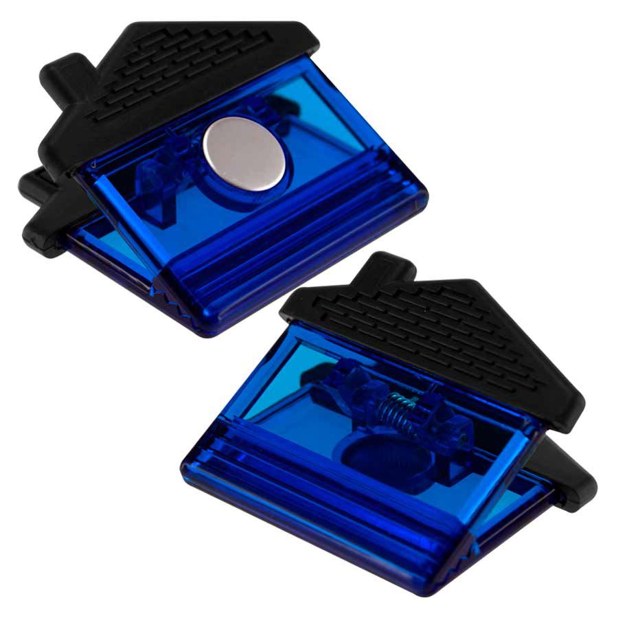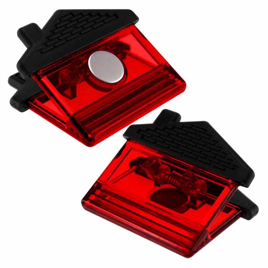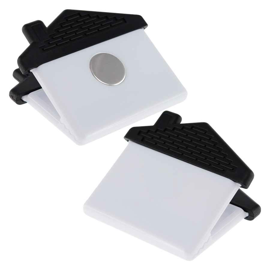 Magne-Clip Grande con forma de Casa y mango de goma negra. Amplia superficie para impresión de logo.