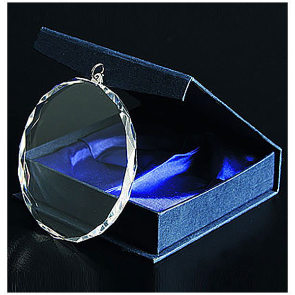 Medalla de cristal con un alto índice de refracción. Perfecto para grabado láser. Presentación en estuche azul con interior de paño de seda y protección de aislapol.