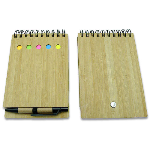Memo set ecológico libretita con tapa de bambú que incluye set de post-it y bolígrafo ecológico.