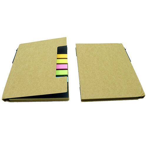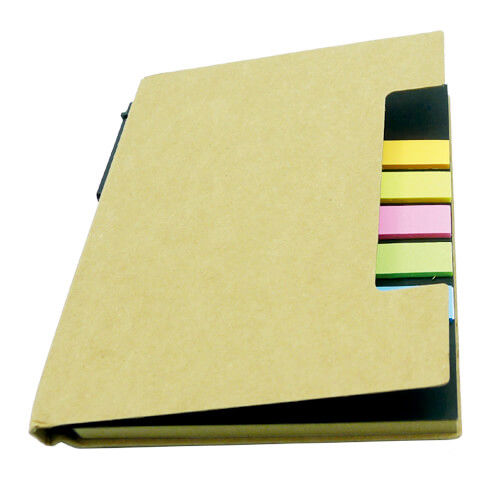 Memo set ecológico libreta que incluye set de Flag Post-it y bolígrafo ecológico, tinta azul.