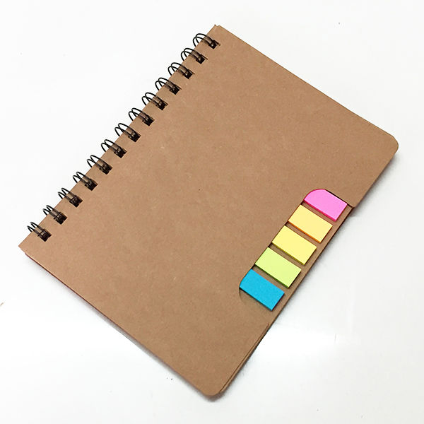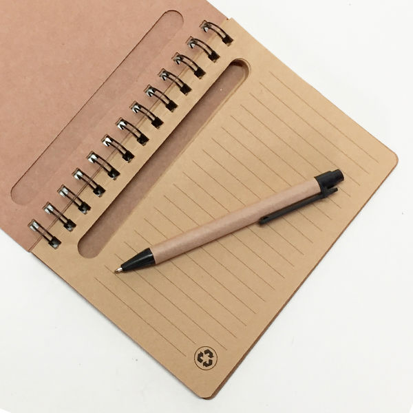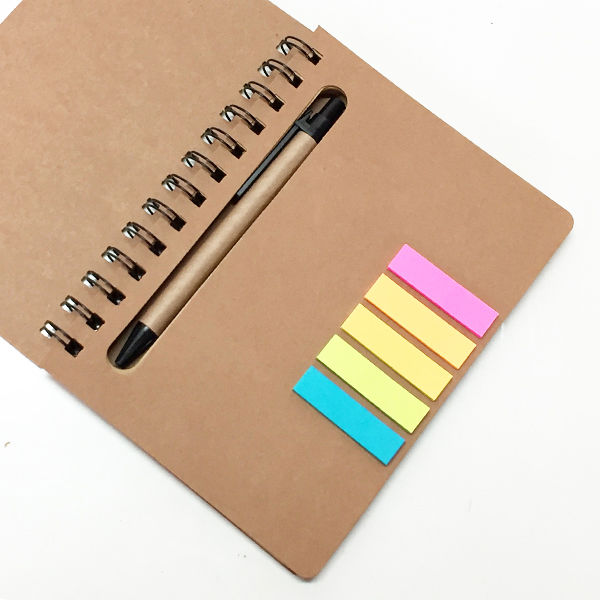 Memo set ecológico libreta con anillado doble cero metálico. Incluye set de post-it y bolígrafo ecológico, tinta azul.