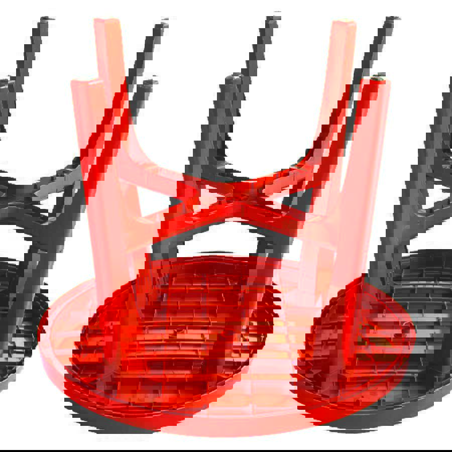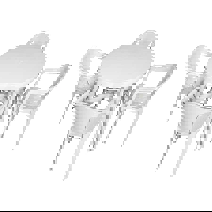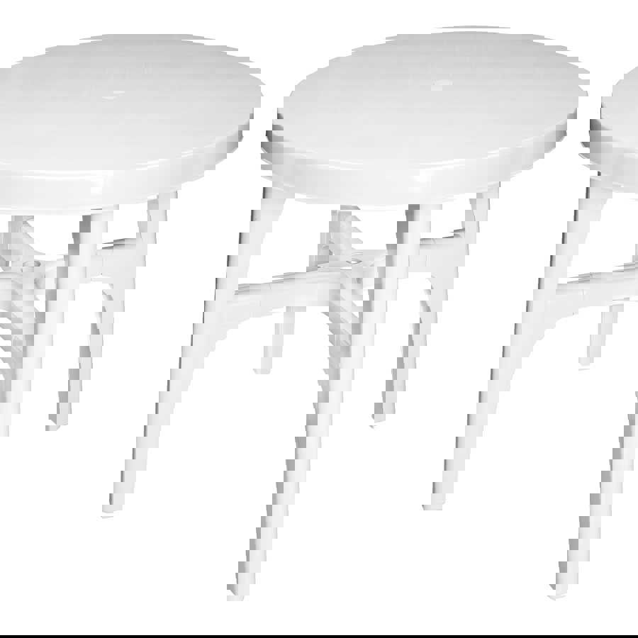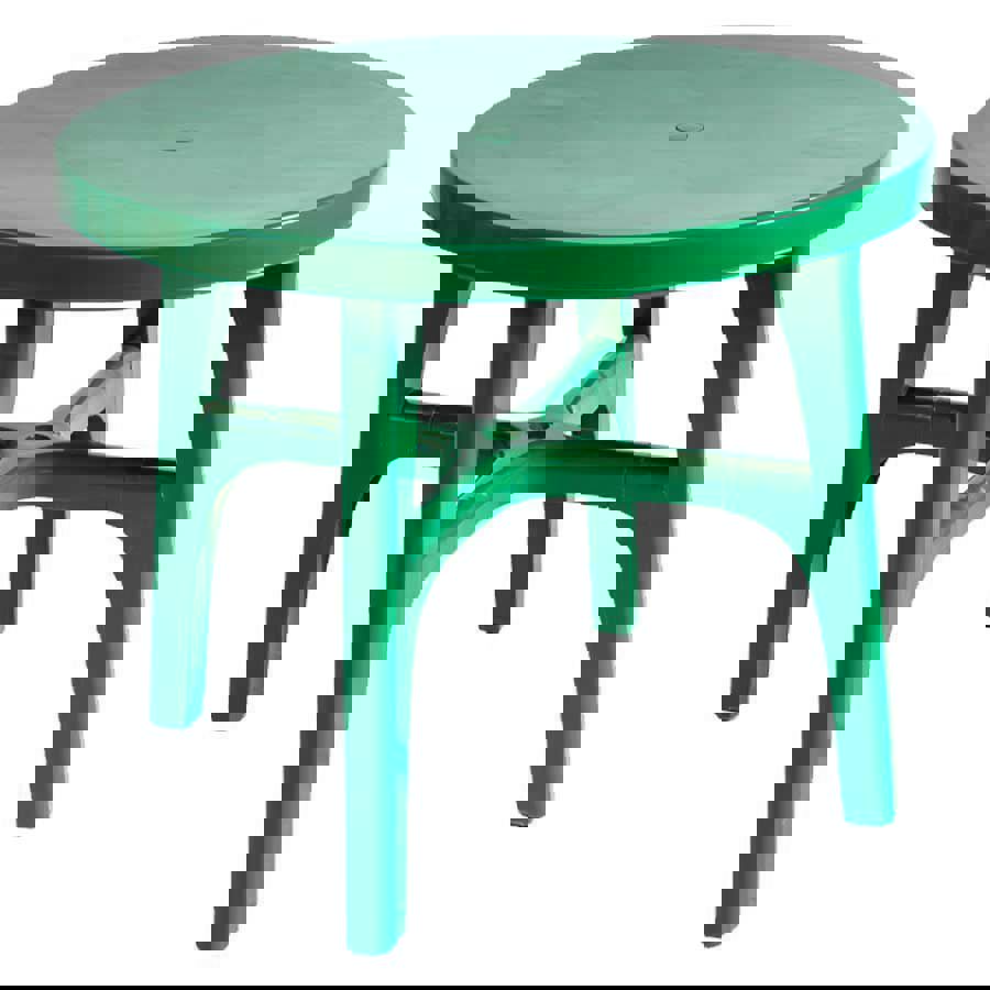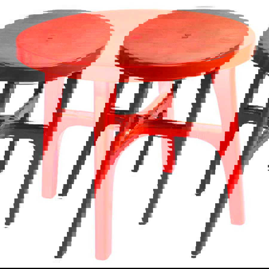 Mesa Plástica redonda modelo «Roma» de Polipropileno. Cuenta con base de 4 patas desarmables adosadas (unidas entre sí), lo que le da una resistancia y estabilidad superior a los modelos nacionales, con topes anti-deslizantes en las 4 patas. Ideal para terrazas, jardines, playa o eventos. Puede usarse tanto en interiores como en exterior. Es muy liviana, pesa sólo 5.6 kgs. y como es desarmable, ocupa poco espacio y es muy fácil de trasladar y guardar en grandes cantidades. Fácil de lavar. Producto importado de calidad superior.