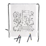 Mochila de non-woven en color blanco especialmente diseñada para colorear con ceras. Incluye 5 ceras de cuerpo cilíndrico en variados colores. Con cuerdas autocierre en color negro y refuerzo en las esquinas.