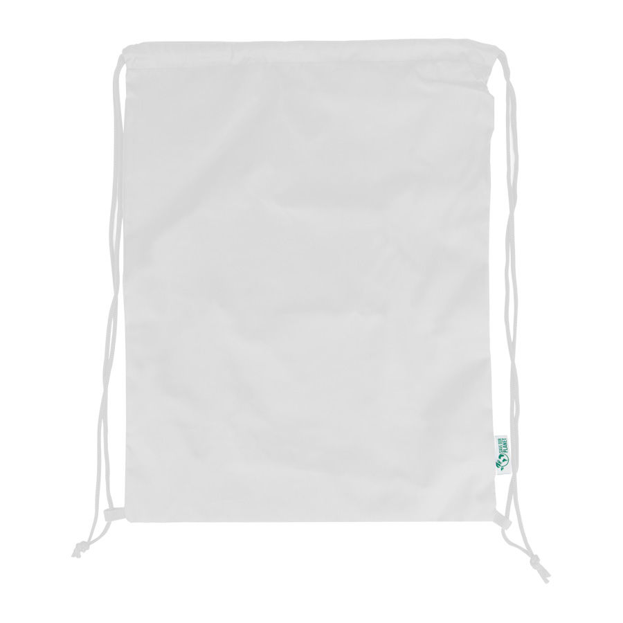 Mochila tipo Morral, fabricada en tela reciclada RPET, con tiras de cordón también el tela reciclada RPET .