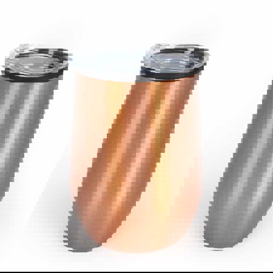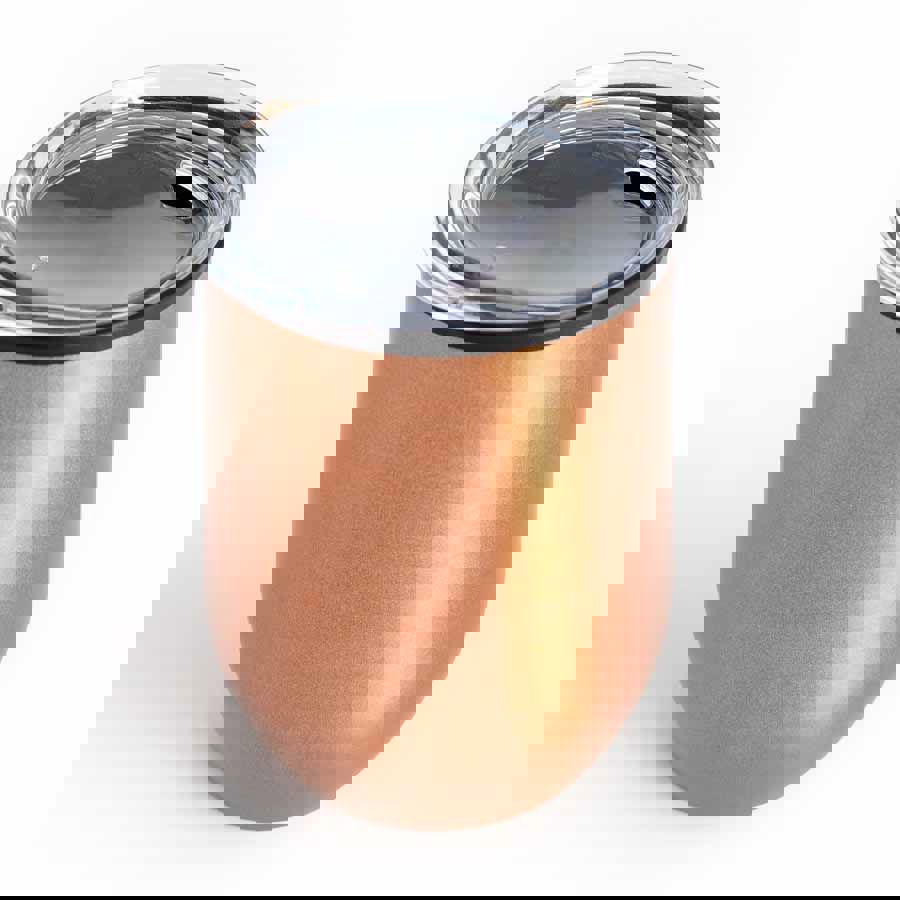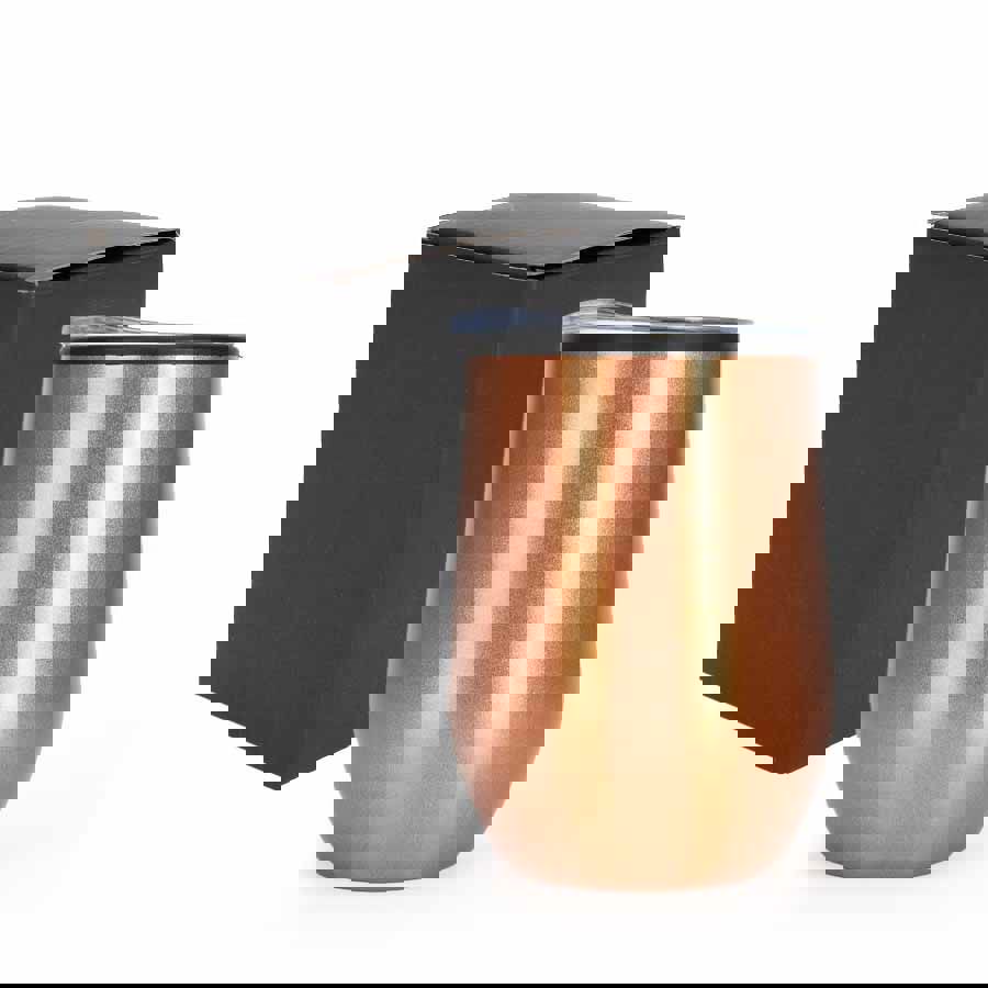 Mug metálico doble pared aislante, interior plástico PP, exterior Acero inoxidable 201 SS recubierto con pintura POWDER COAT color cobre. Producto BPA FREE, para el contacto con líquidos y alimentos. Fondo de silicona negra ABS anti-deslizante. Tapa removible de plástico PS Crystal Clear con sello cilíndrico de silicona. Capacidad 600ml. Presentación en bolsa PP + caja de regalo de cartón negro.