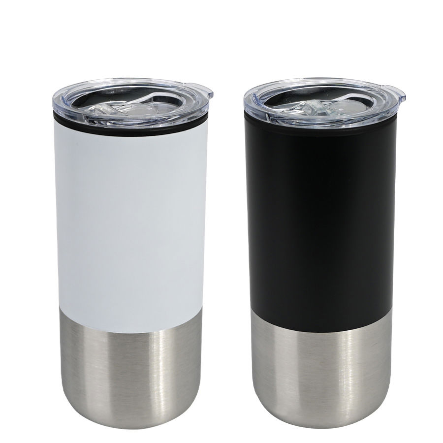 Mug metálico bicolor doble pared aislante, interior plástico PP, exterior plástico PP con pintura POWDER COAT, combinado con Acero inoxidable 201 SS, modelo «THEO». Producto BPA FREE, para el contacto con líquidos y alimentos. Fondo de silicona negra ABS anti-deslizante. Tapa removible de plástico PS Crystal Clear con sello cilíndrico de silicona. Capacidad 450ml. Presentación en bolsa PP + caja de regalo de cartón negro.