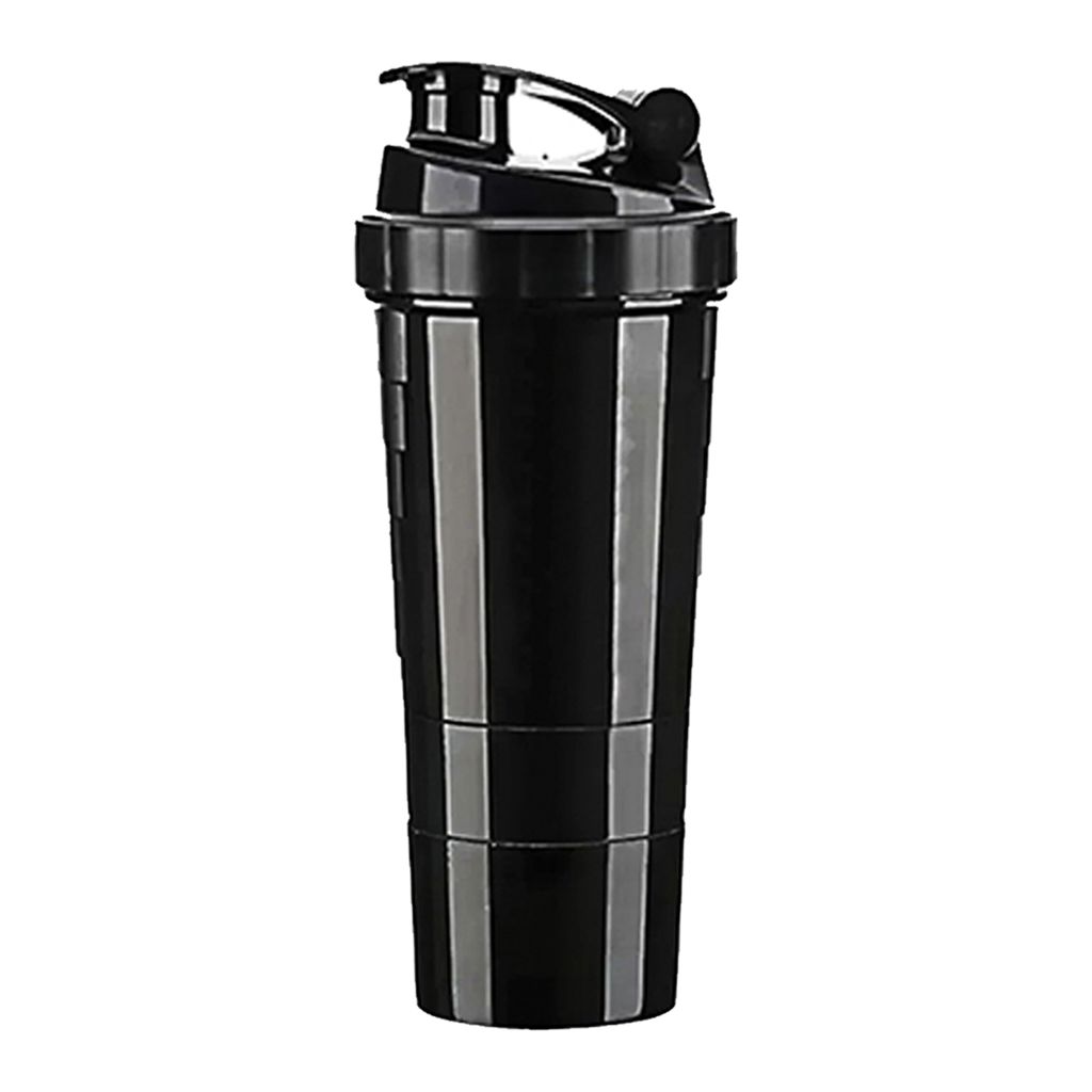 Vaso mezclador para batidos de suplementos. Incluye dos compartimientos en base enroscable, uno tipo pastillero y otro para polvo de suplemento alimenticio.