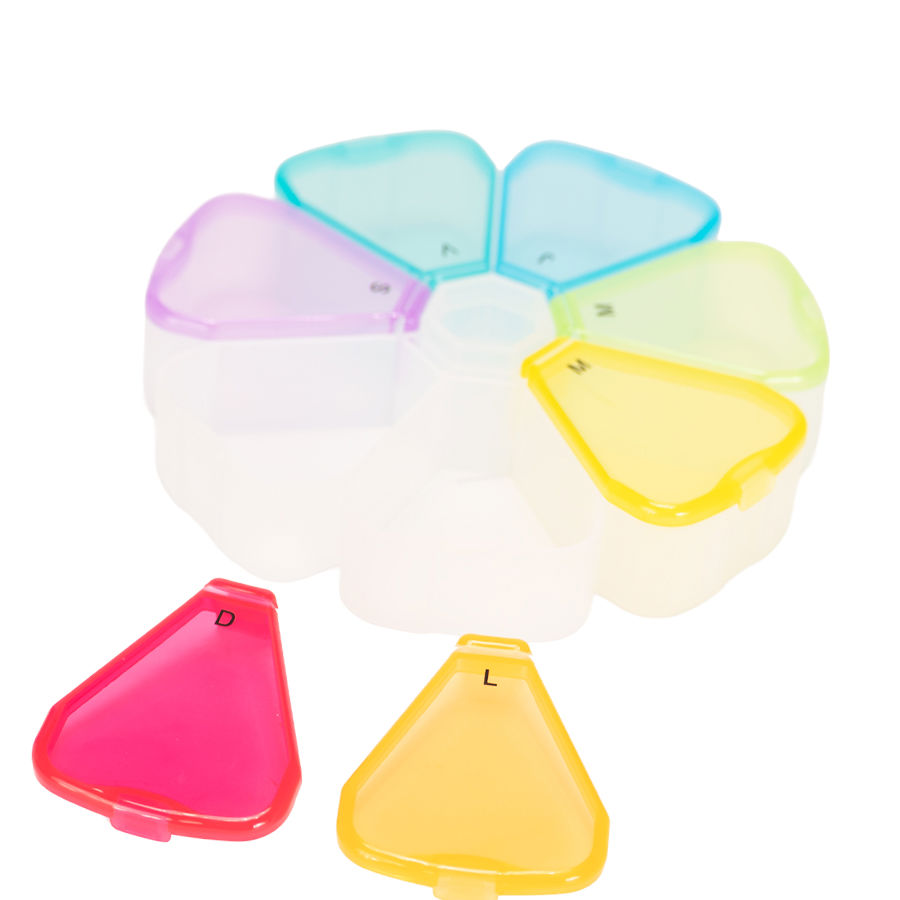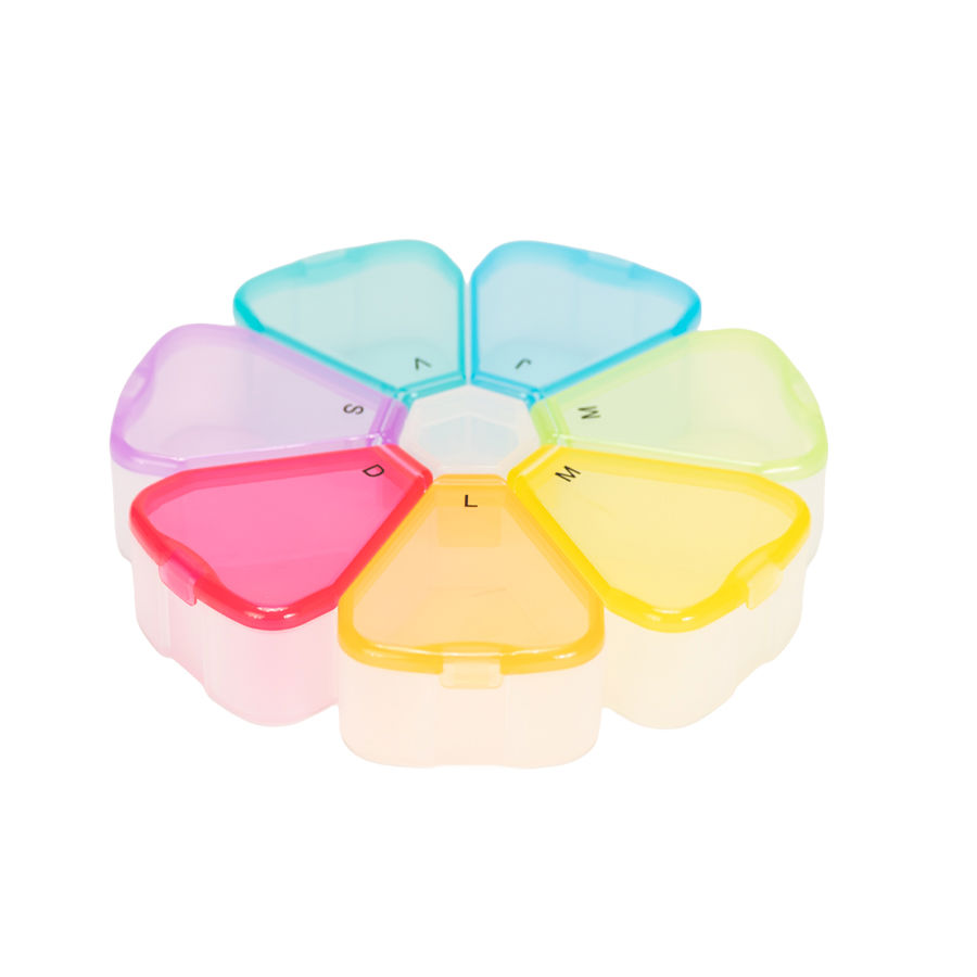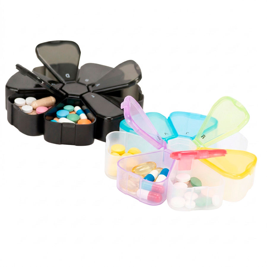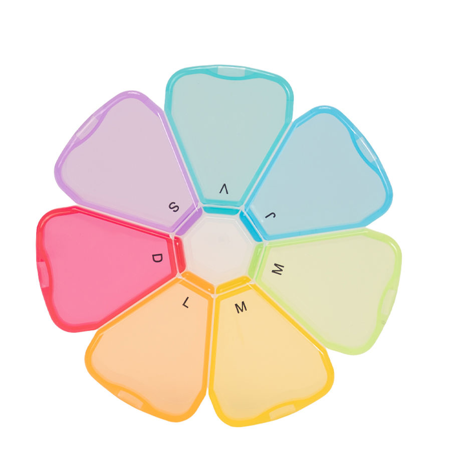 Pastillero Plástico de PVC «FLOWER» con forma de flor, con 7 compartimentos triangulares de diferentes colores translúcidos, identificados y ordenados con las iniciales de los 7 días de la semana. Presentación el bolsa blanca biodegradable + caja de cartulina blanca.