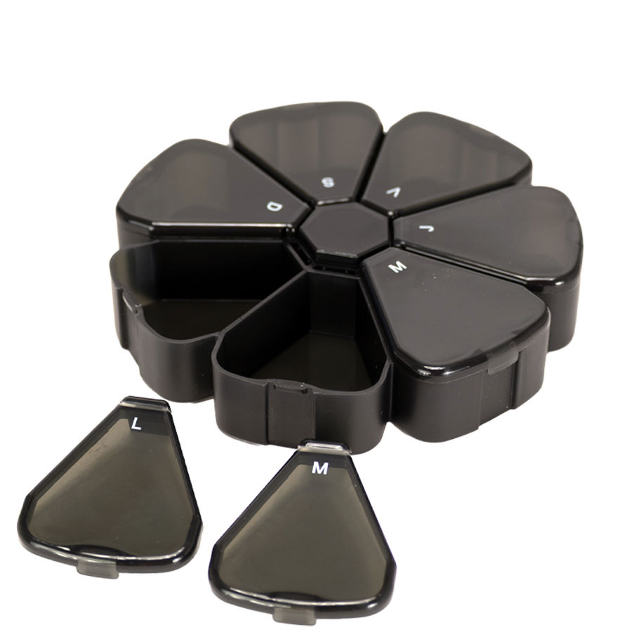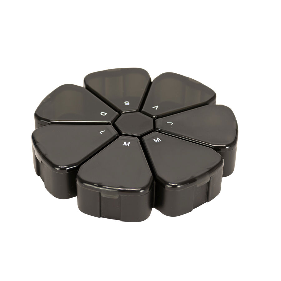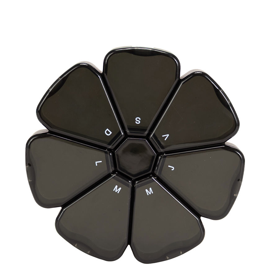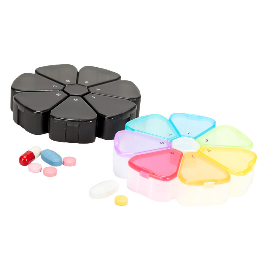 Pastillero Plástico de PVC «FLOWER» con forma de flor, con 7 compartimentos triangulares de diferentes colores translúcidos, identificados y ordenados con las iniciales de los 7 días de la semana. Presentación el bolsa blanca biodegradable + caja de cartulina blanca.