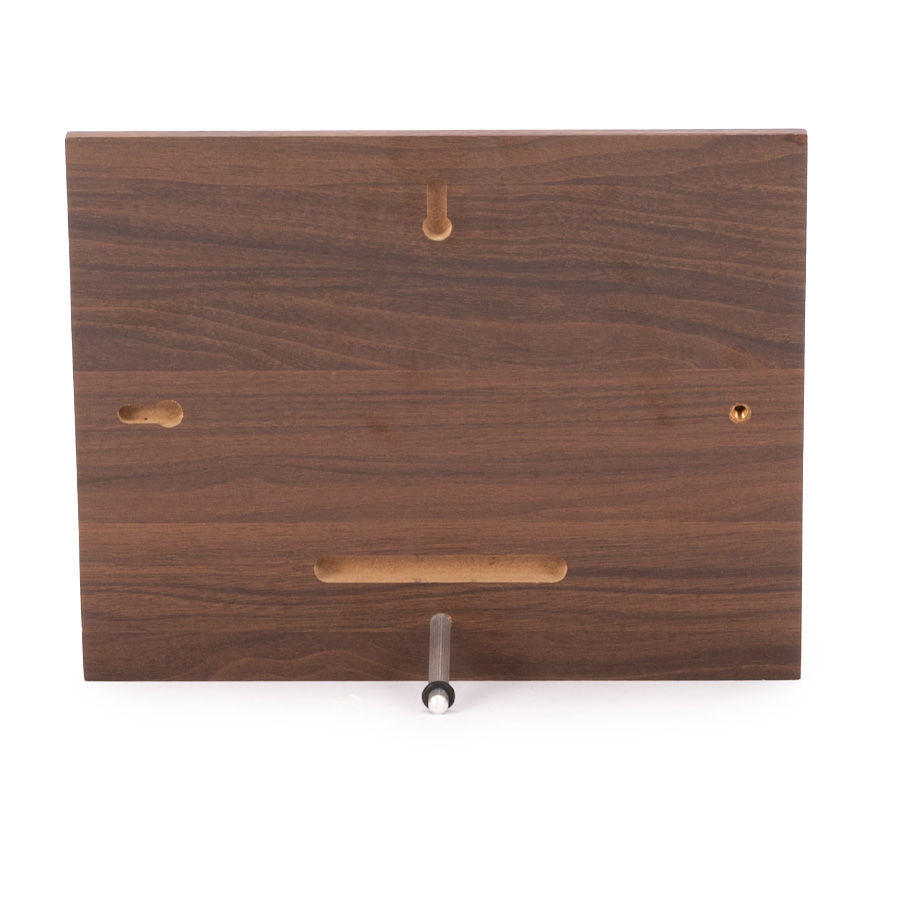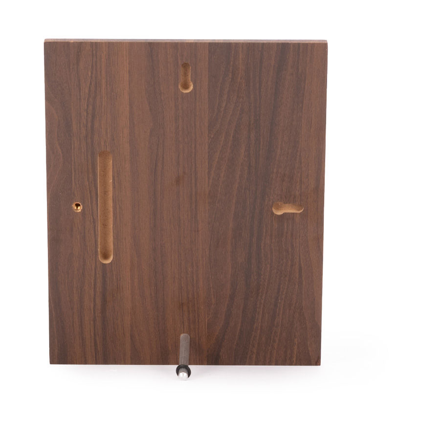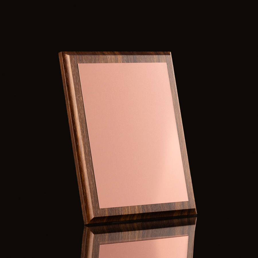 Placa metálica color cobre, modelo «STUDIO», montada sobre base rectangular de madera barnizada con cantos troquelados. En su parte posterior, incluye orificios y soporte metálico para exhibición vertical u horizontal. Presentación en caja de cartón forrado negro con cierre imantado, interior acolchado de espuma y tela poliéster satinado negro, con troquel. OJO: la placa metálica viene con film plástico removible, para protección de la misma.